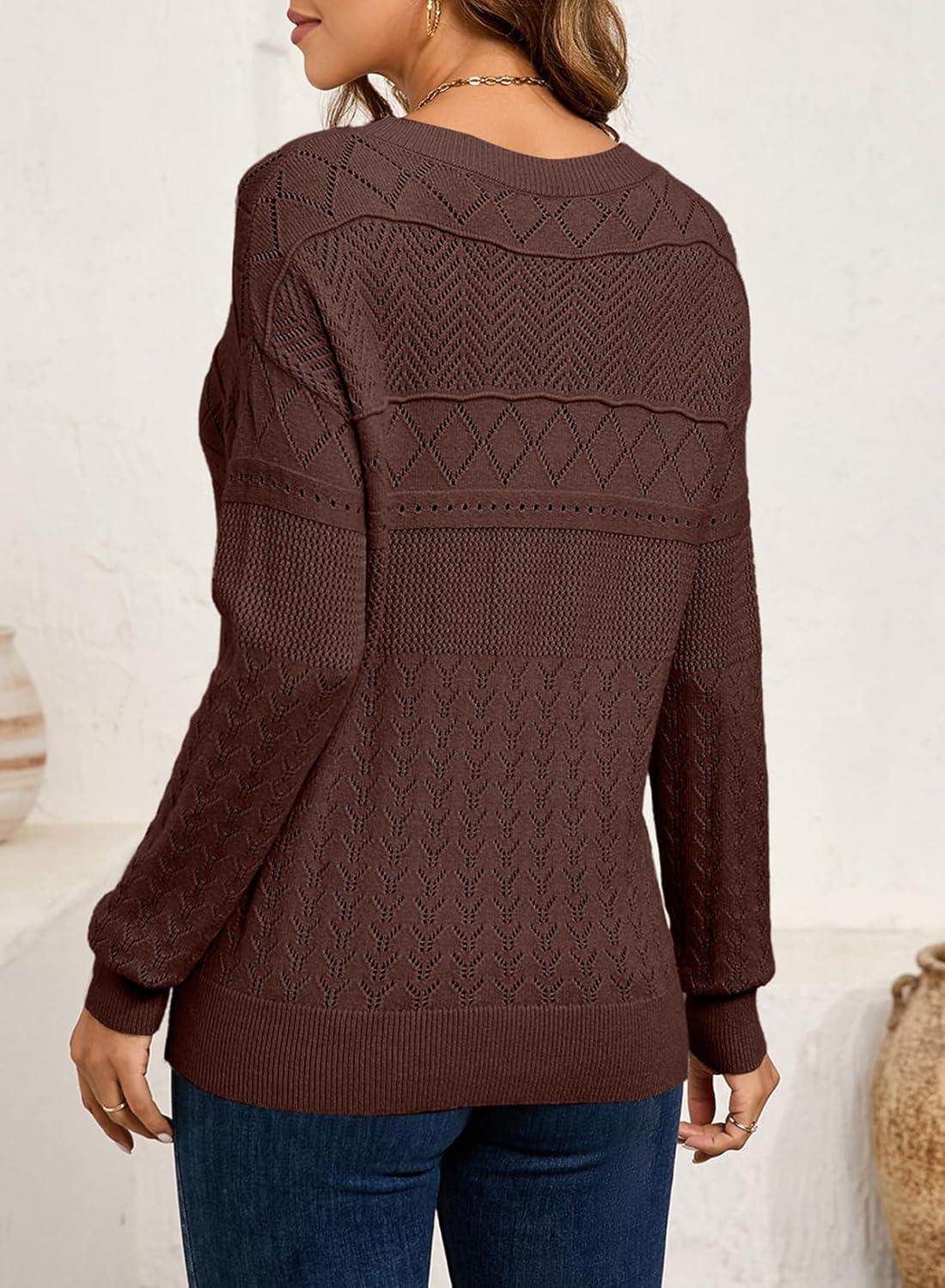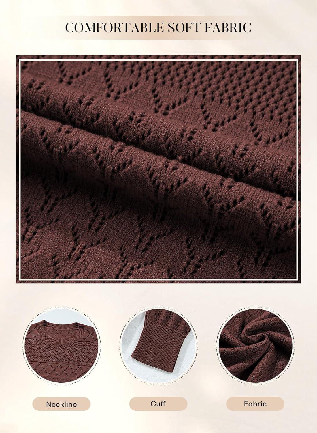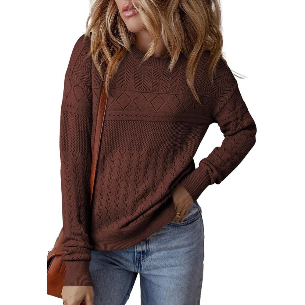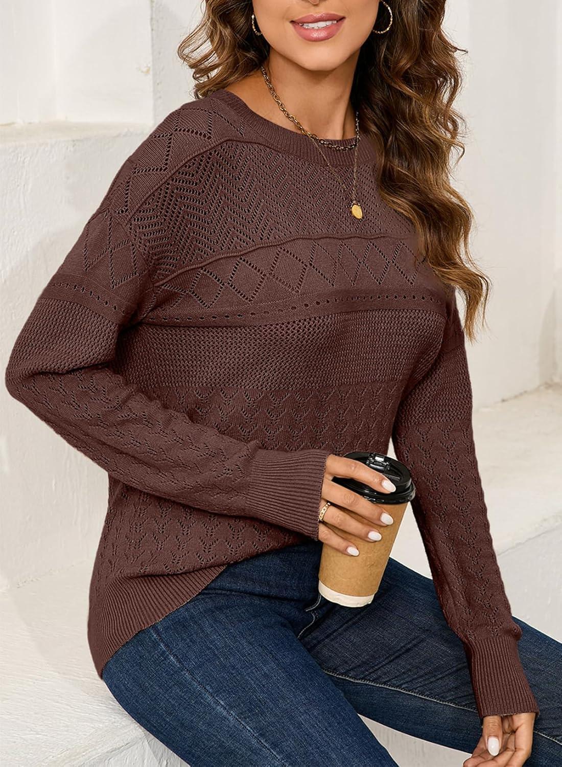 SHEWIN Fall Sweaters for Women Casual Crewneck Long Sleeve Crochet Pullover Tops Sweater(Coffee)