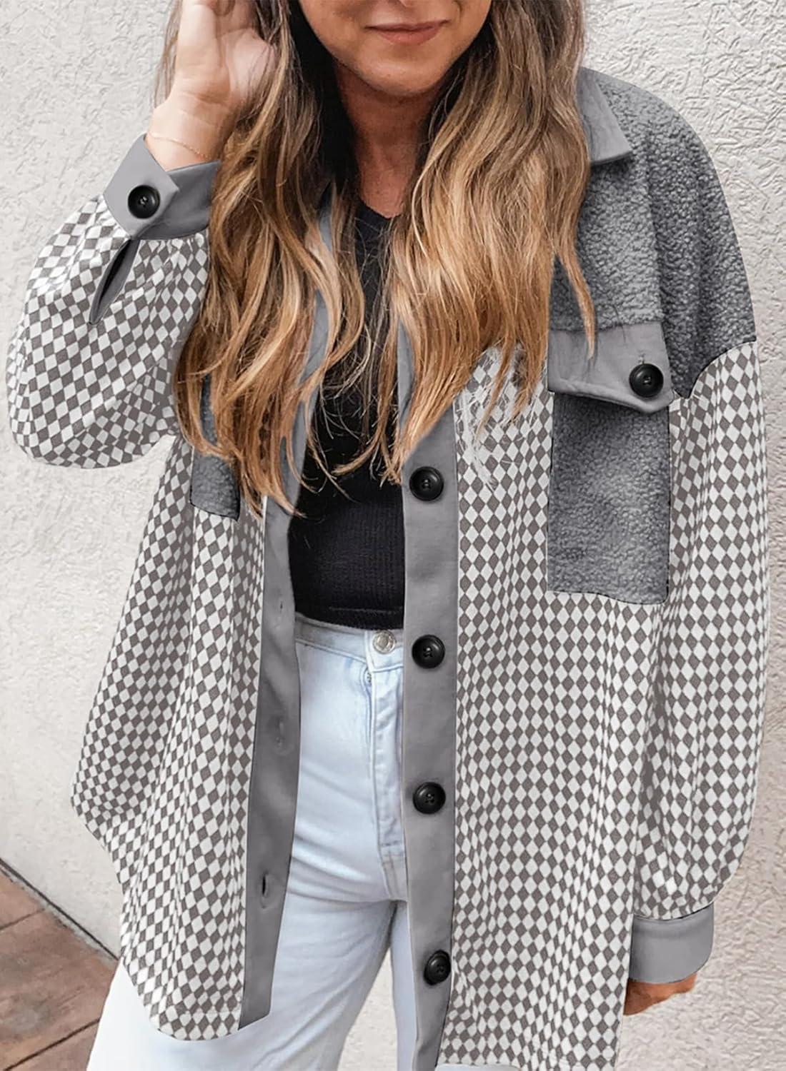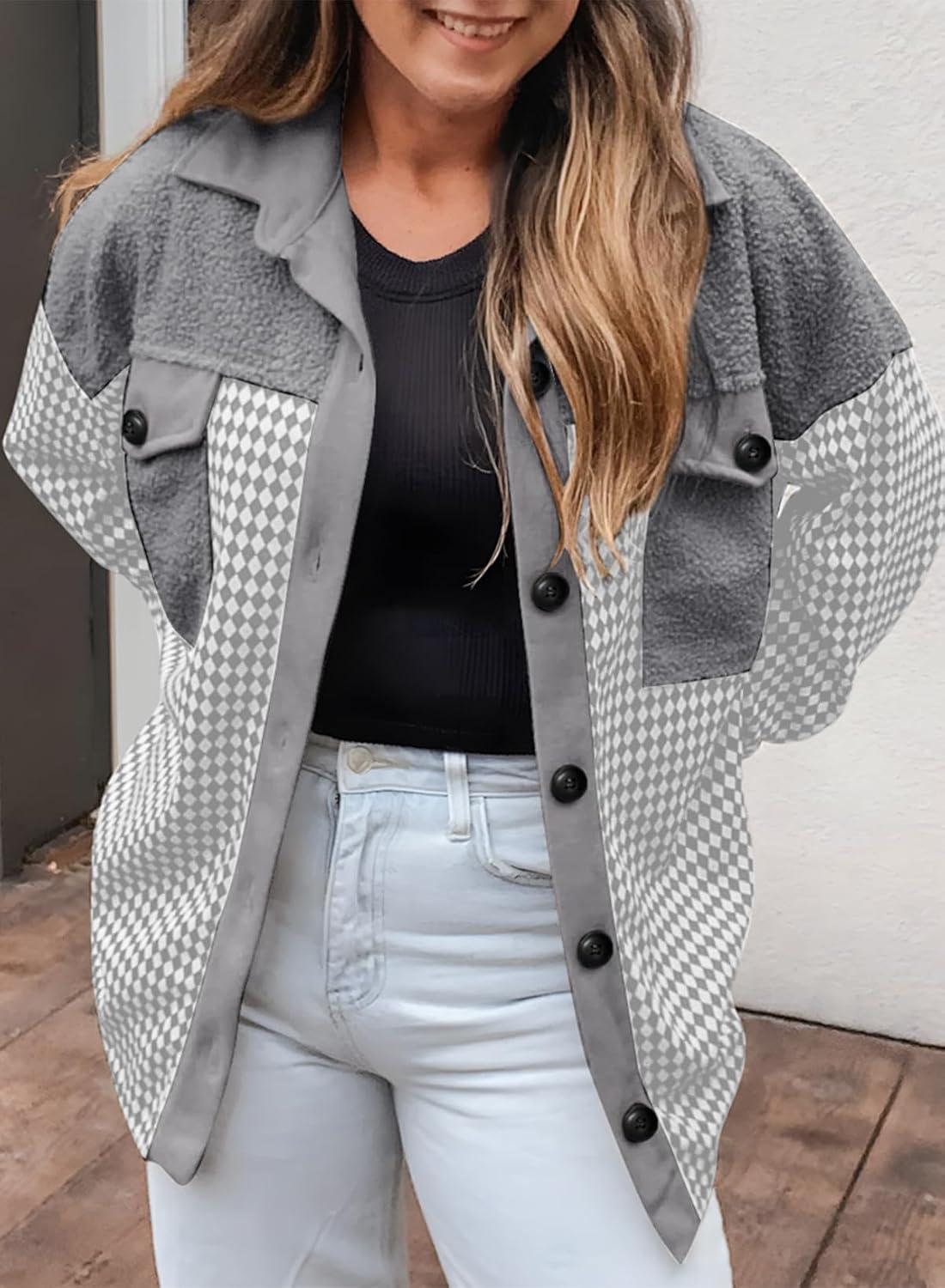 SHEWIN Shackets for Women 2025 Casual Long Sleeve Tops Button Down Plaid Fall Jackets(A1-grey)