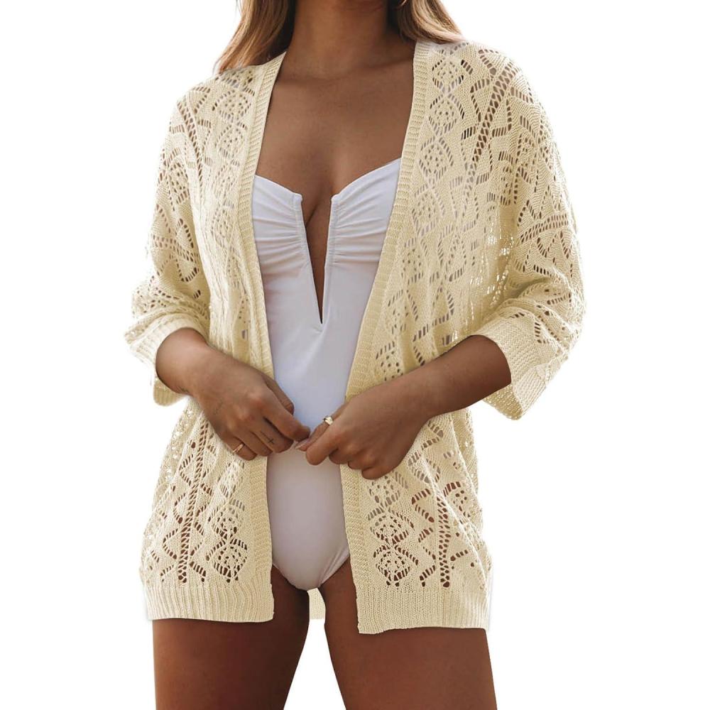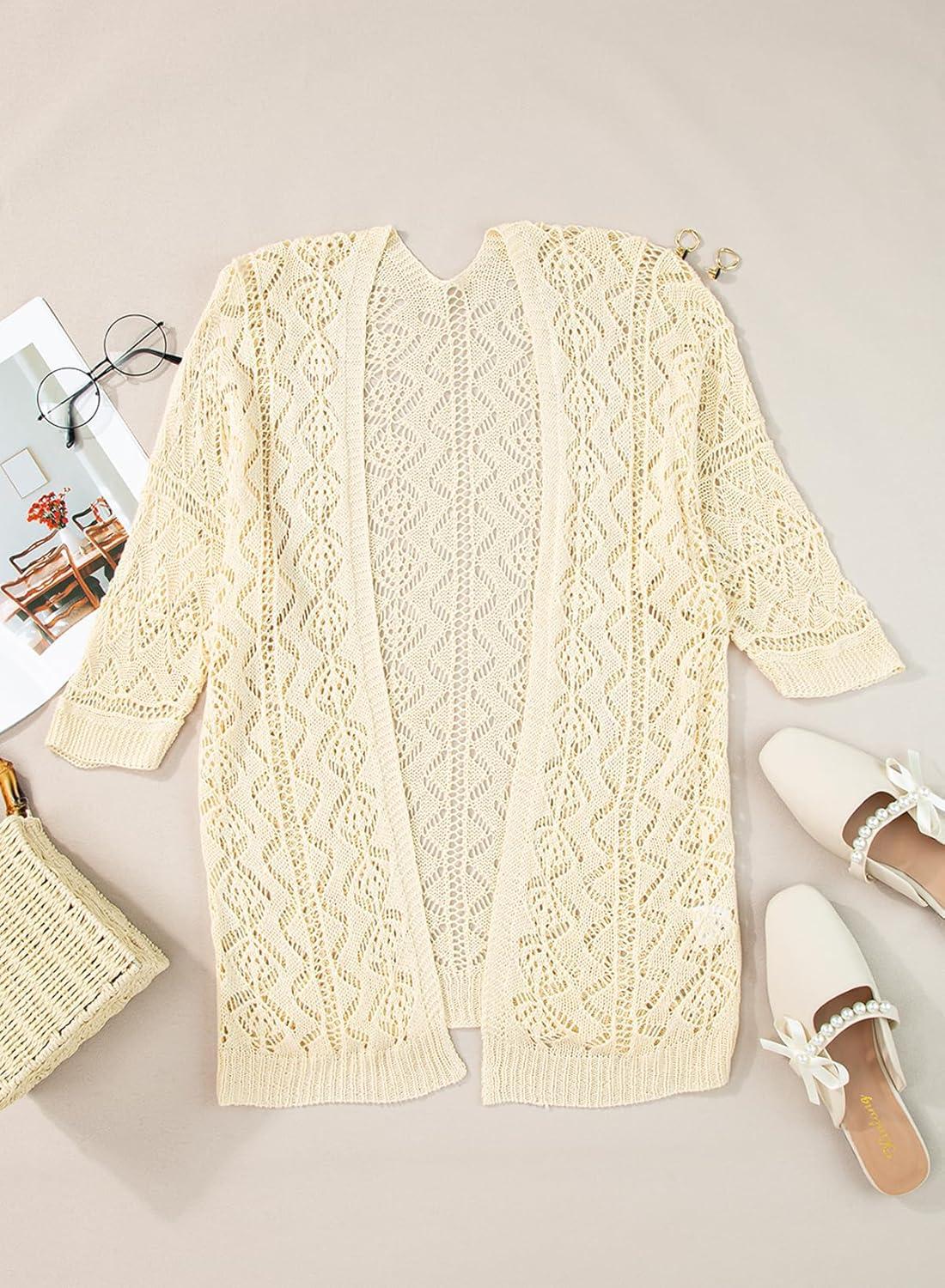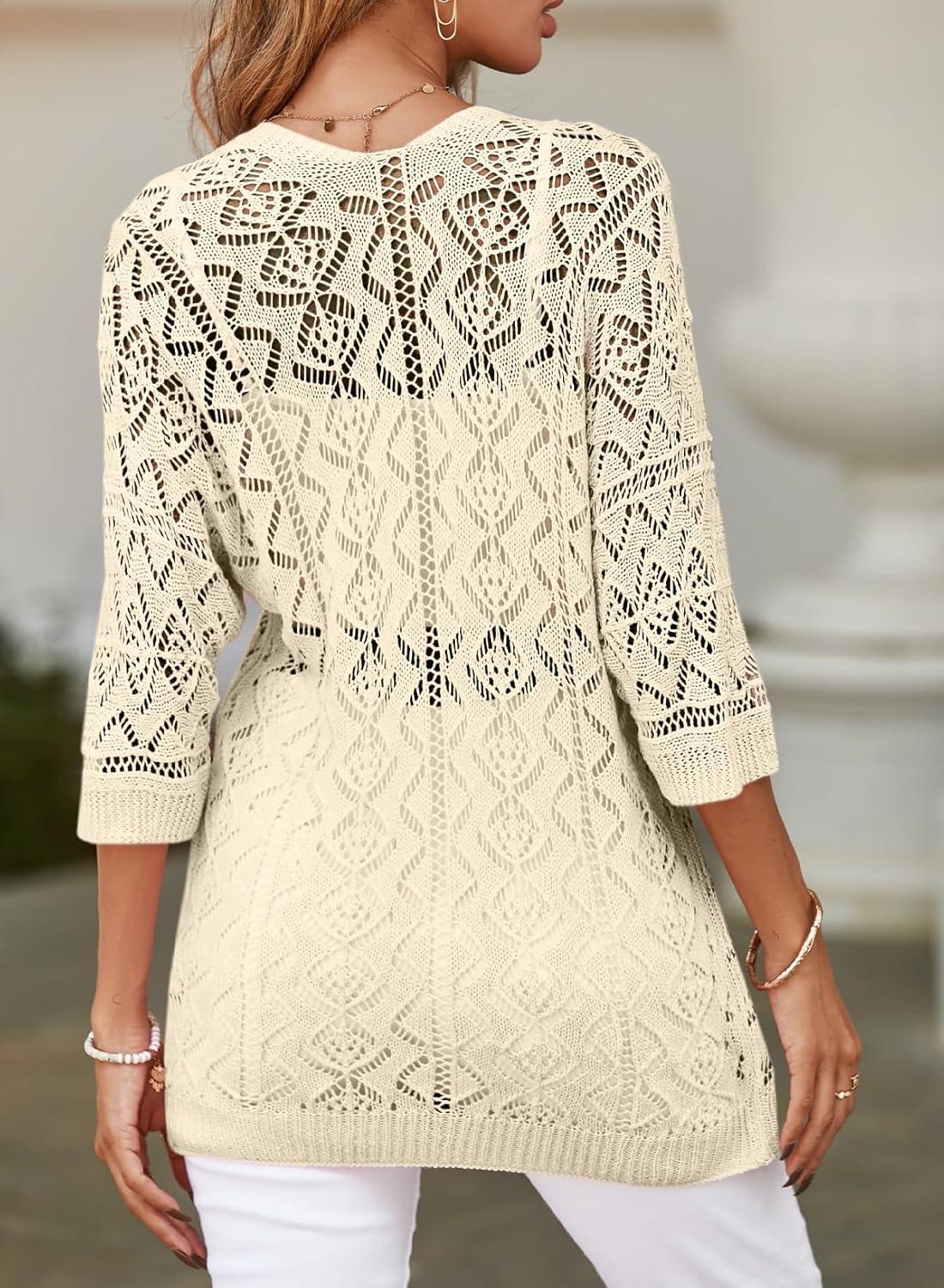 SHEWIN Summer Cardigan Sweaters for Women Lightweight 3/4 Sleeve Open Front Cropped Crochet Beach Cover Ups(B Oatmeal)