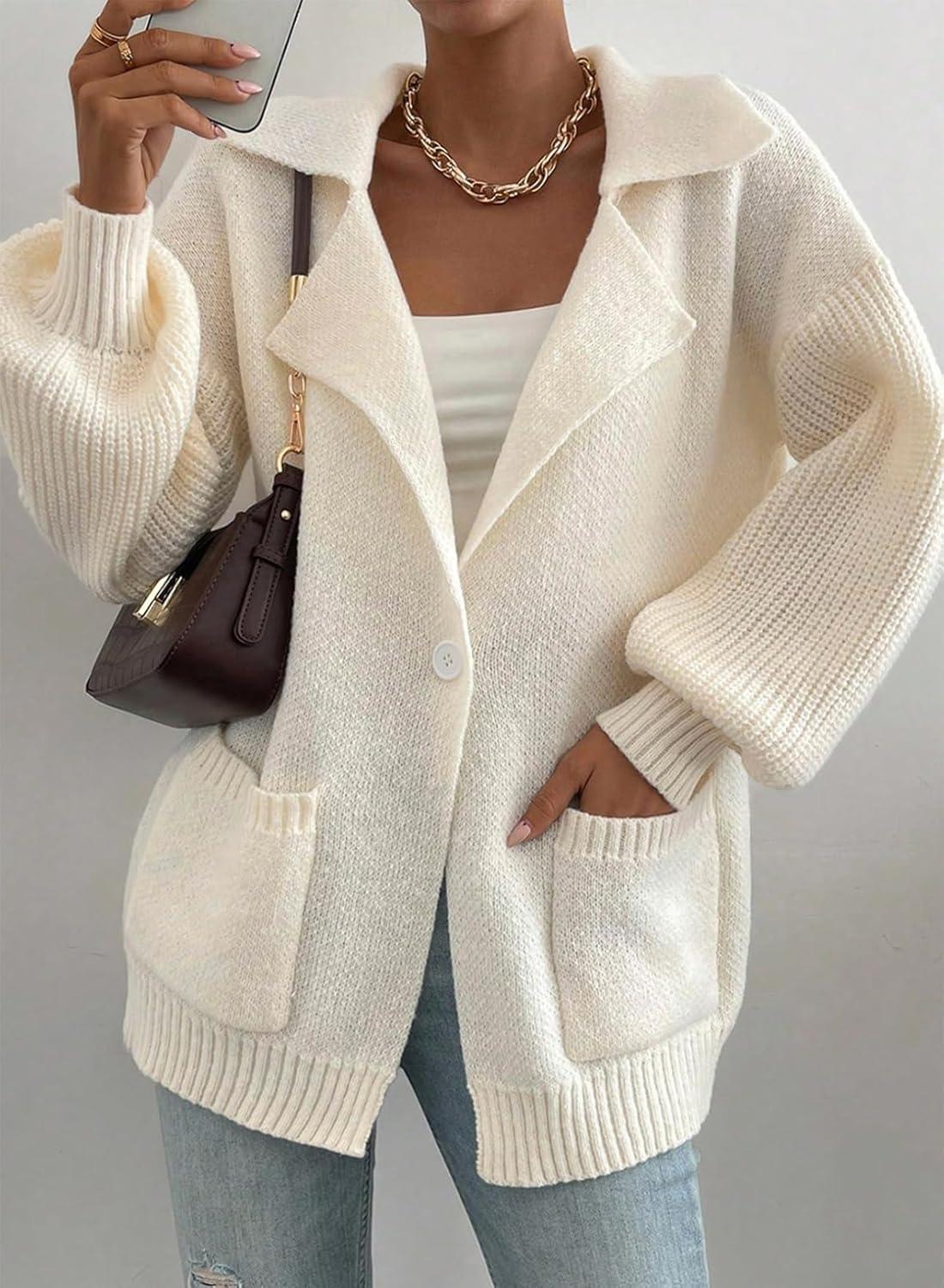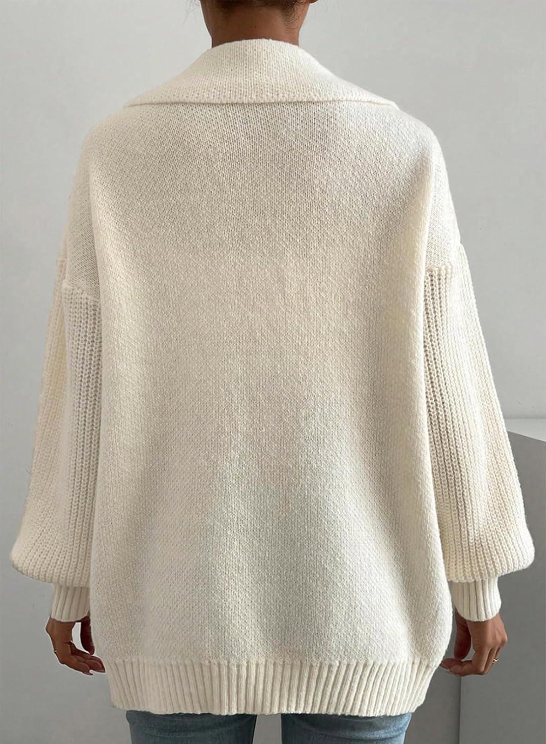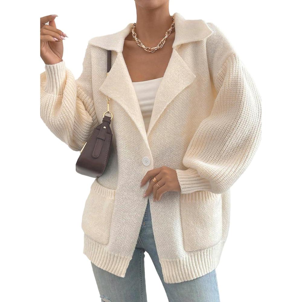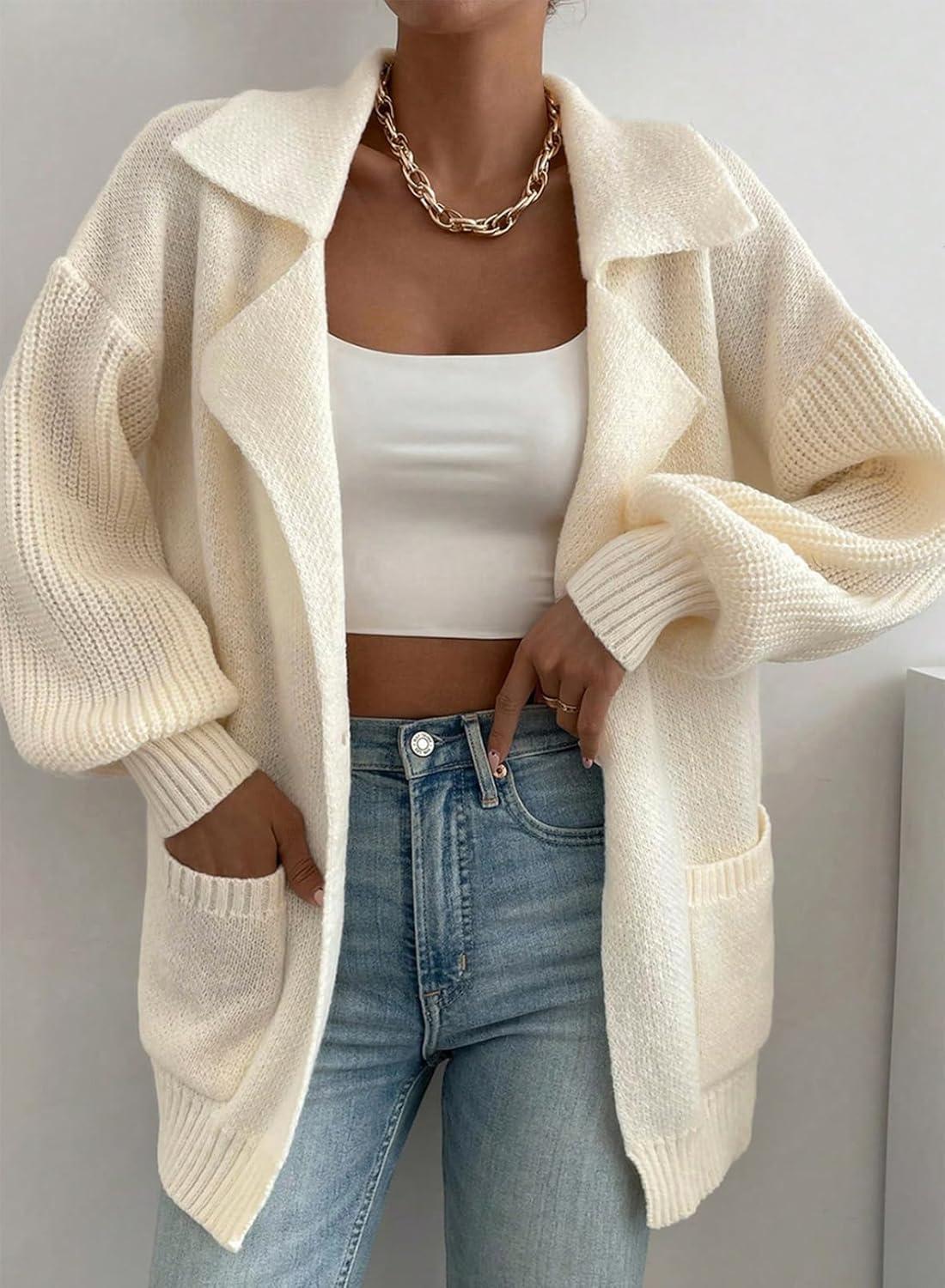 SHEWIN Women Open Front Knit Sweater Oversized Cardigan with Pocket(Beige)