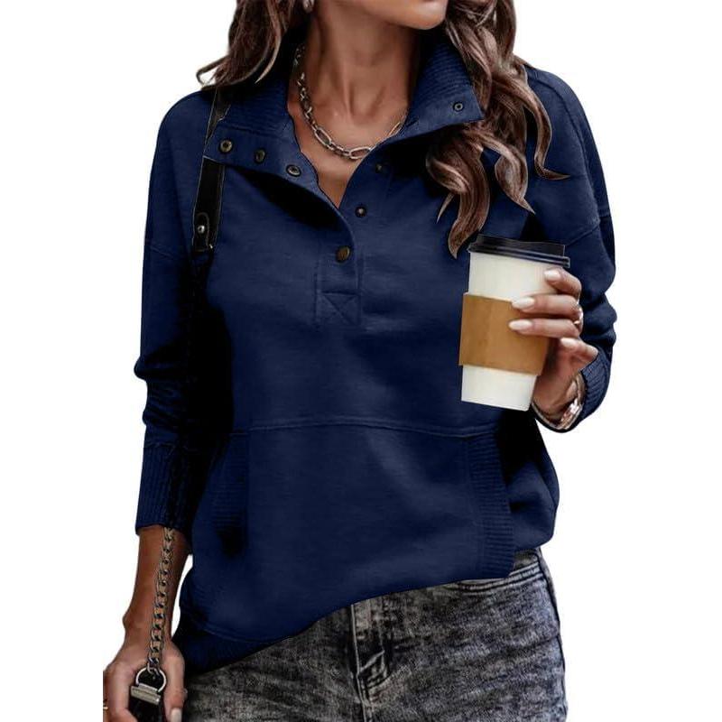 SHEWIN Women’s Casual Long Sleeve Stand Neck Sweatshirt Lightweight Button Drawstring Pullover Tops(D Navy Blue)