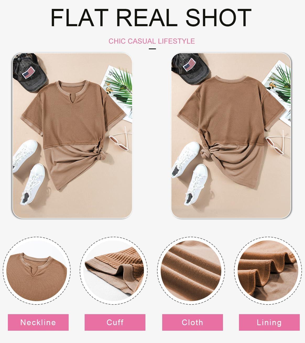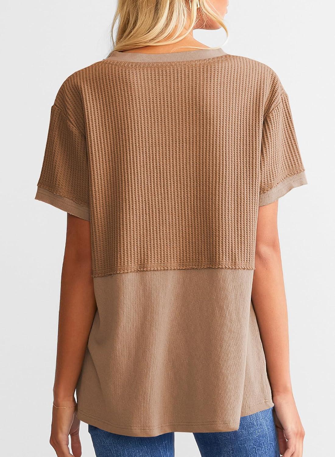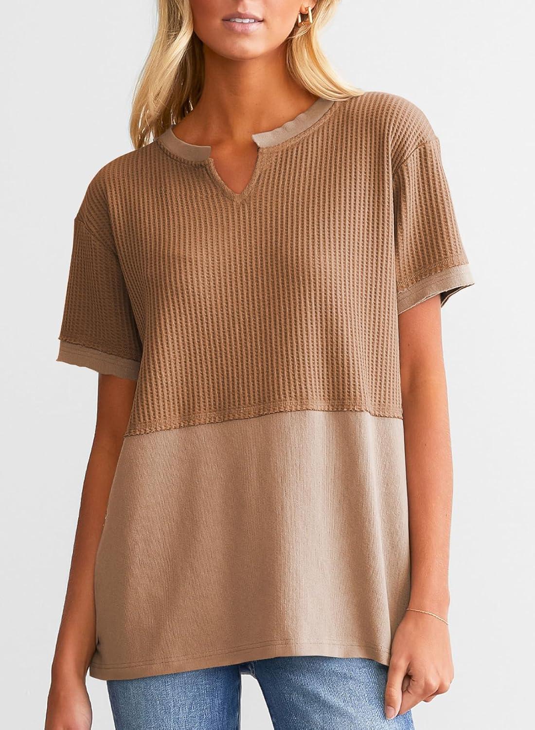 SHEWIN Womens Casual V Neck Waffle Knit Tops Short Sleeve T Shirts Loose Blouses(B Dark Brown)