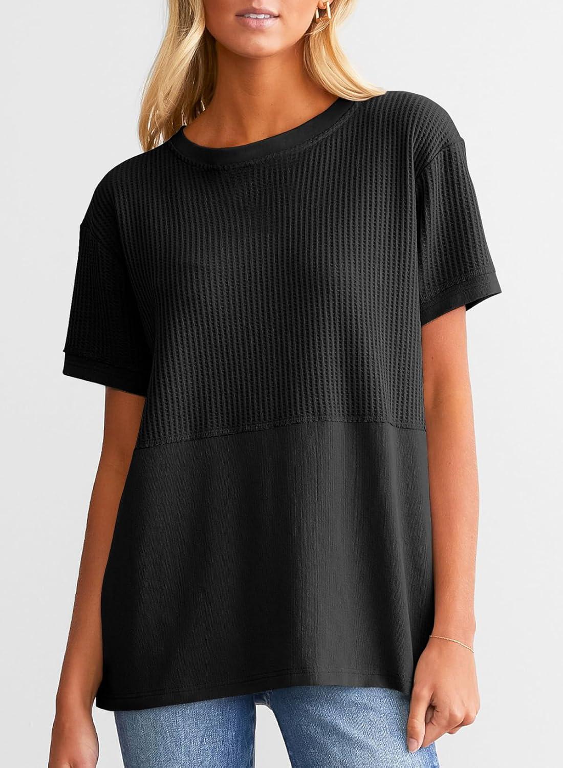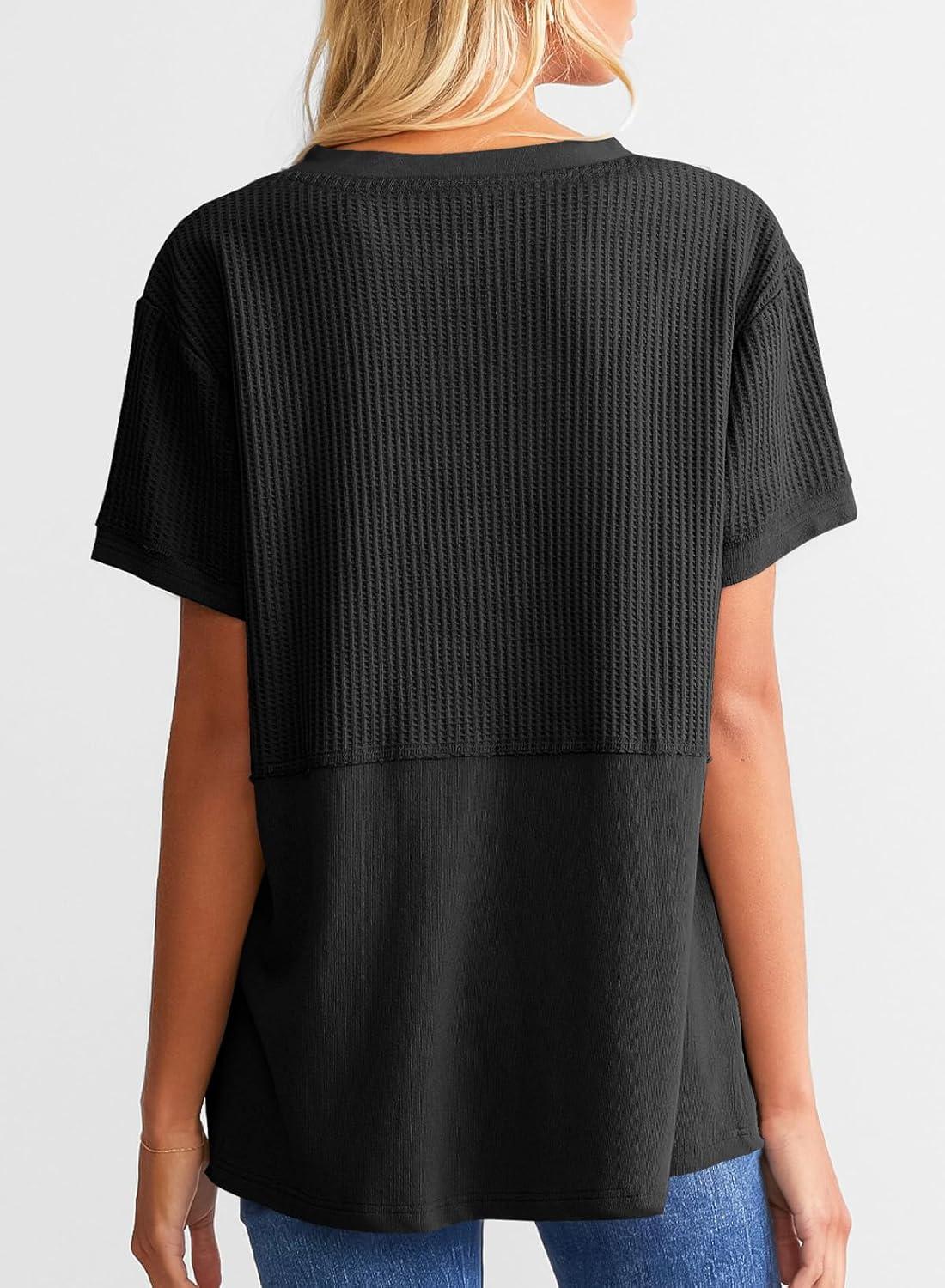 SHEWIN Womens Casual V Neck Waffle Knit Tops Short Sleeve T Shirts Loose Blouses(D Black)