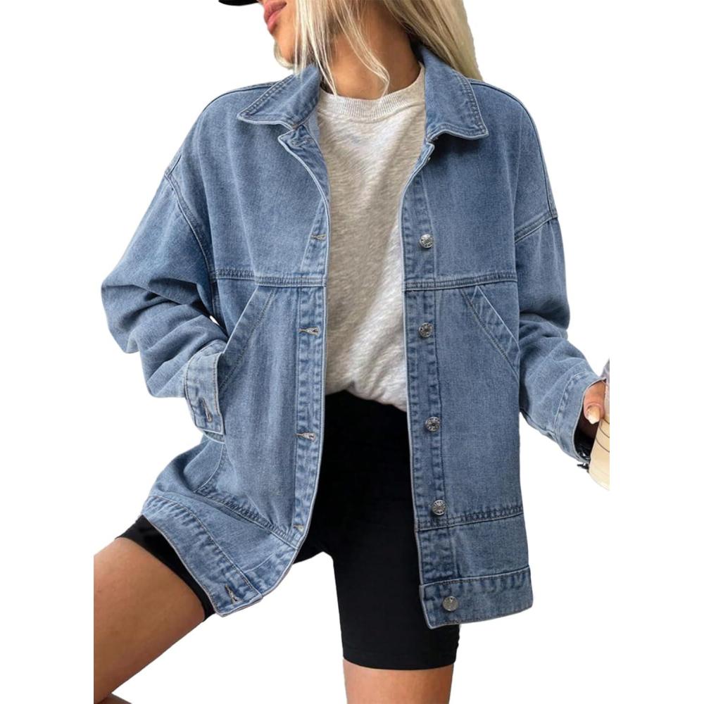 SHEWIN Womens Denim Jacket Casual Long Sleeve Drop Shoulder Button Front Jean Jacket Coat With Pockets(Dusk Blue)