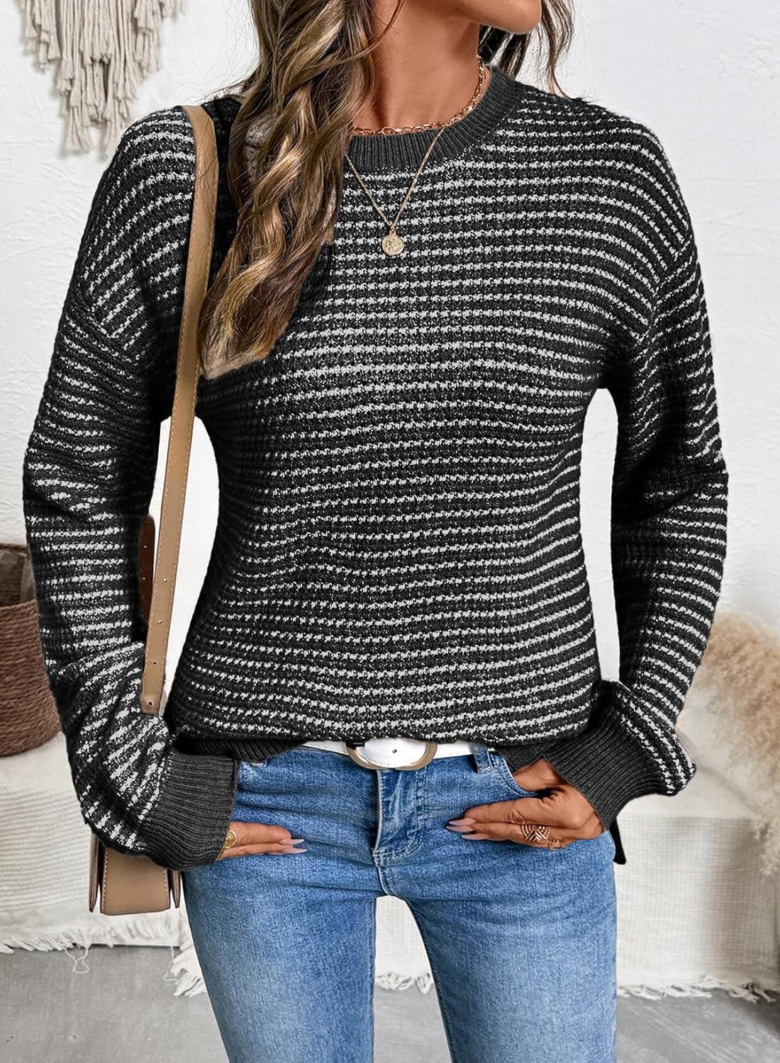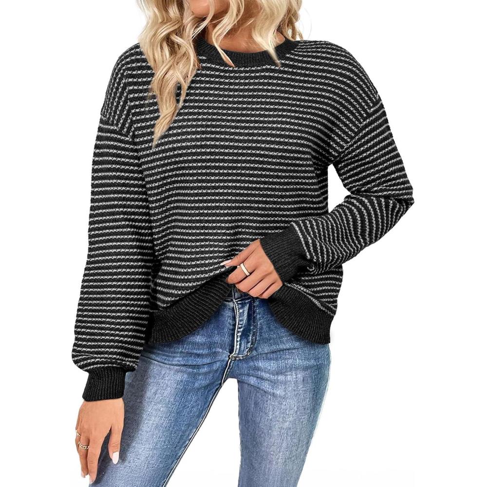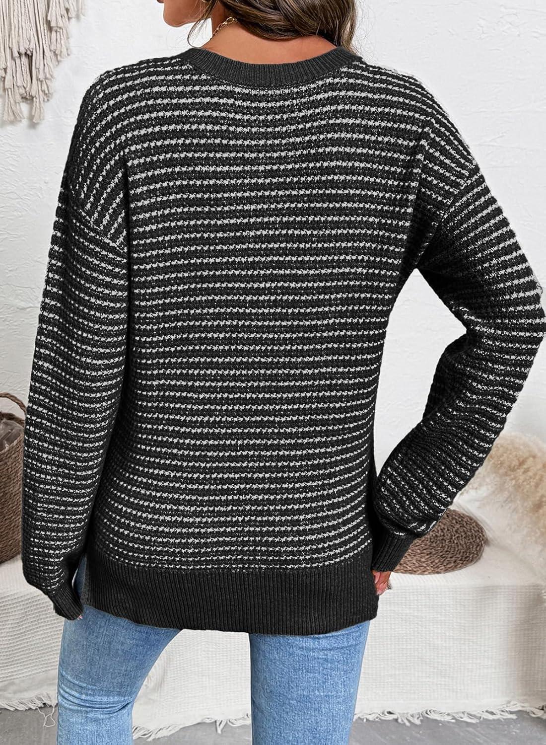 SHEWIN Womens Long Sleeve Crewneck Sweaters Casual Knit Striped Side Split Pullover Sweater Tops(Black)
