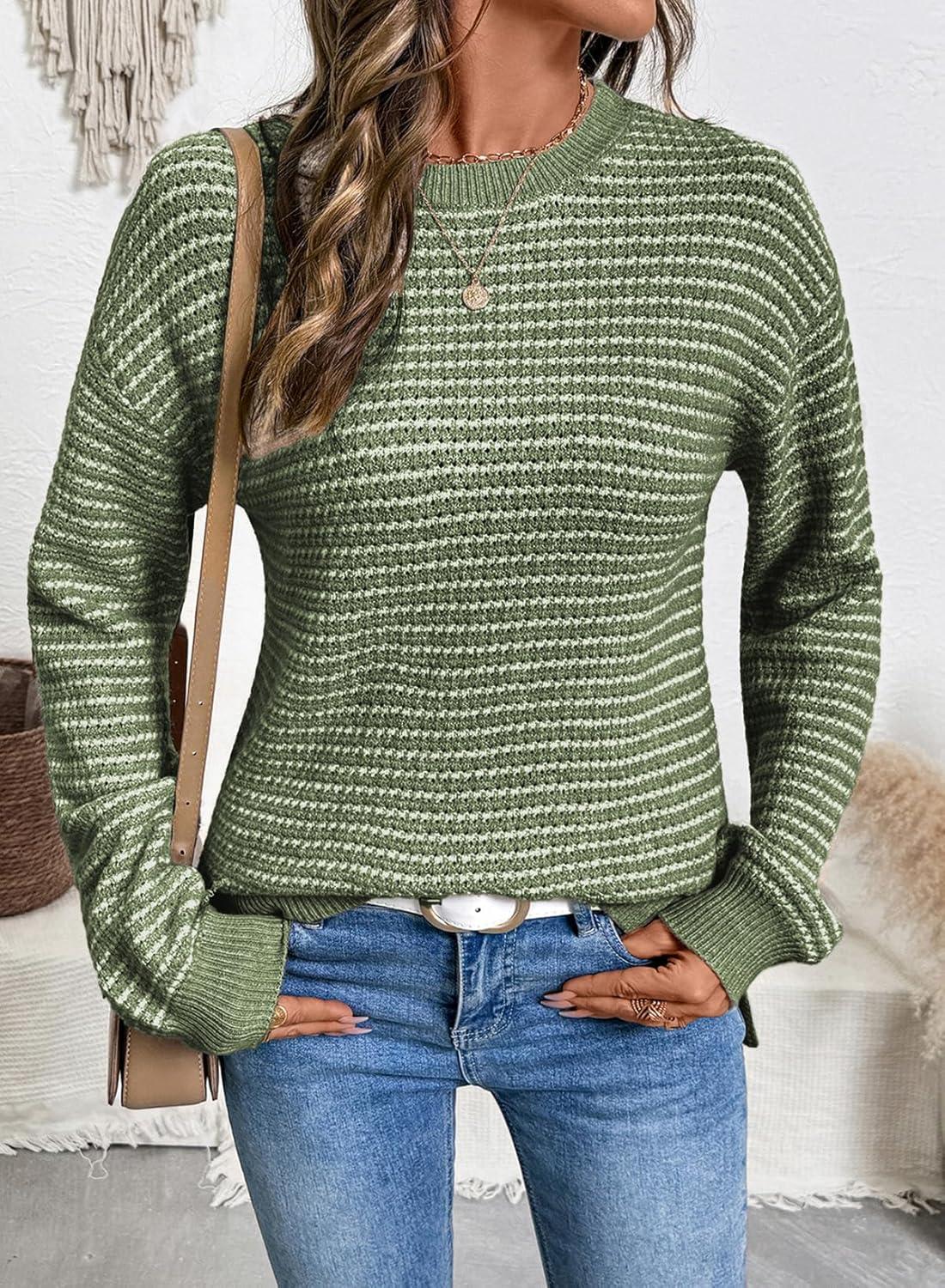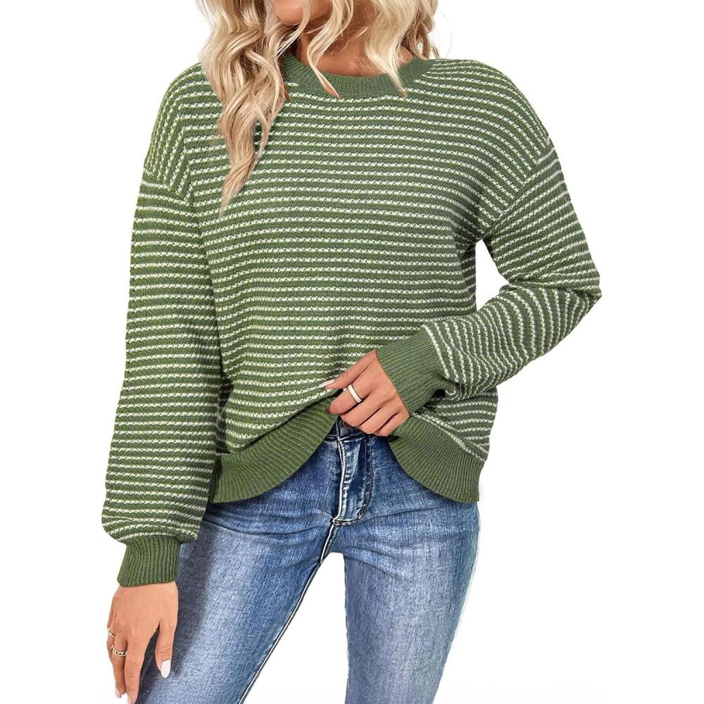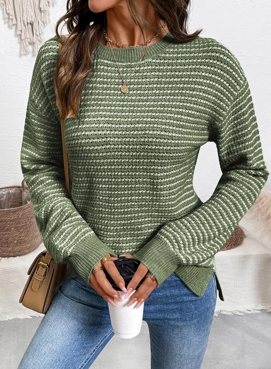 SHEWIN Womens Long Sleeve Crewneck Sweaters Casual Knit Striped Side Split Pullover Sweater Tops(Grass Green)