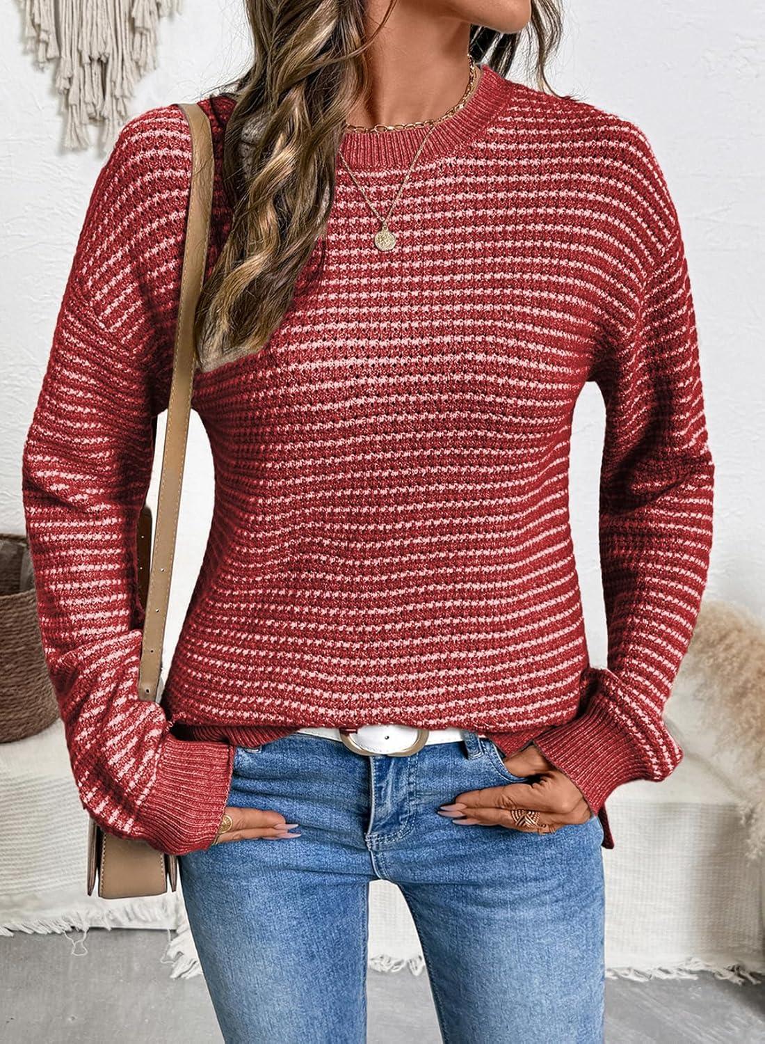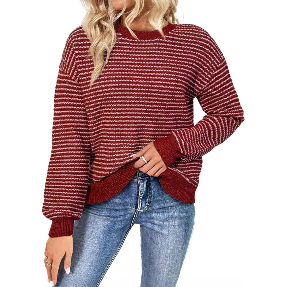 SHEWIN Womens Long Sleeve Crewneck Sweaters Casual Knit Striped Side Split Pullover Sweater Tops(Red)