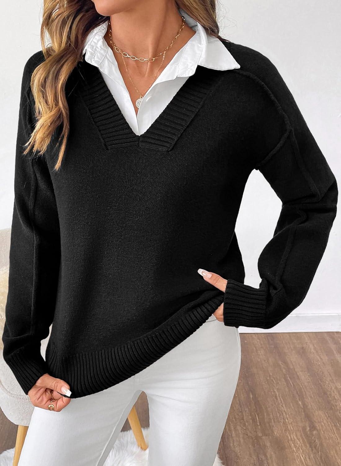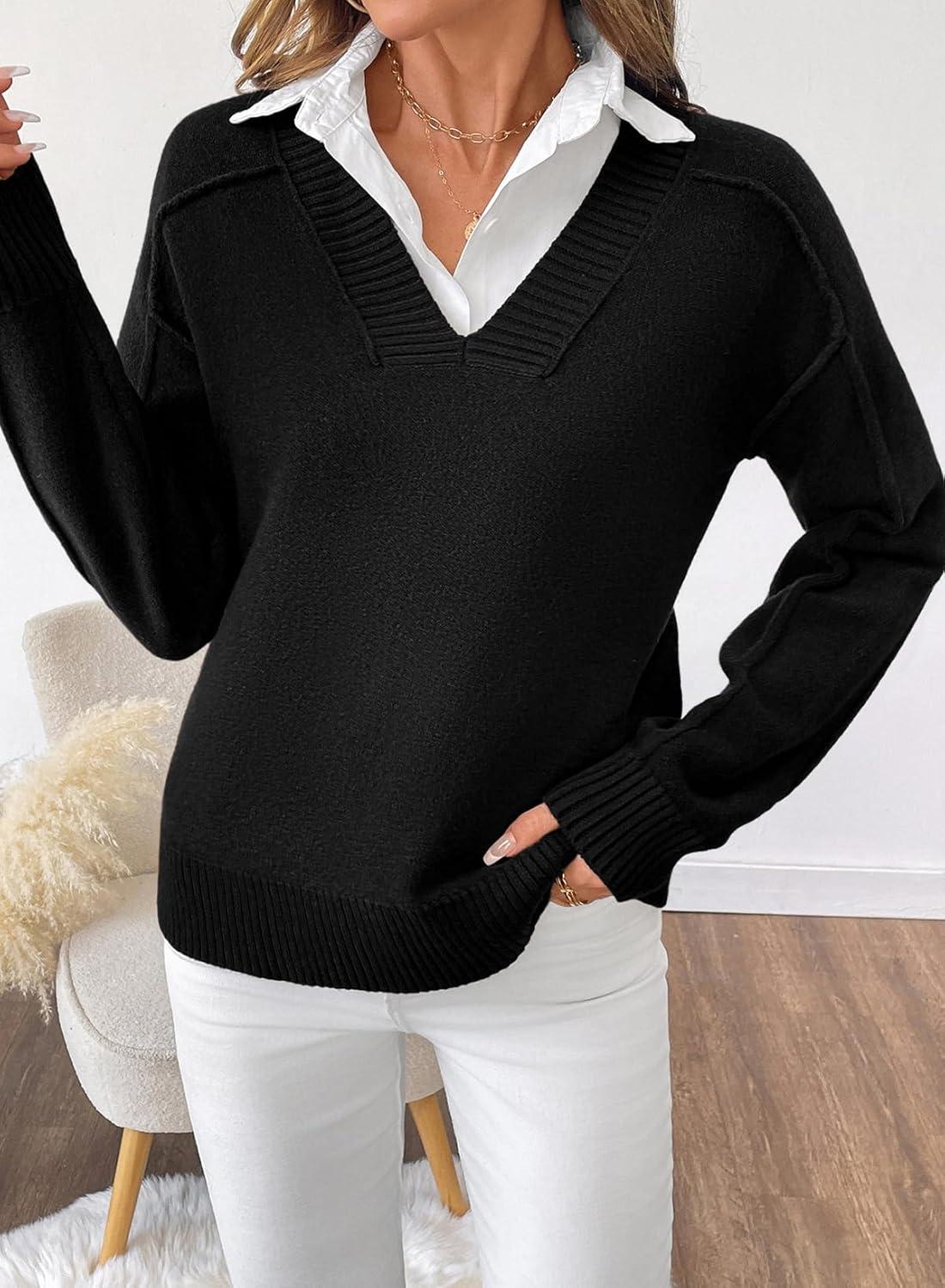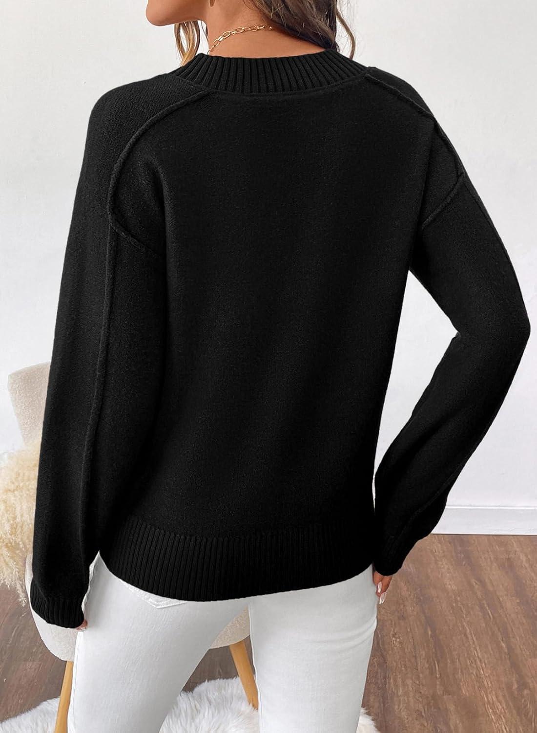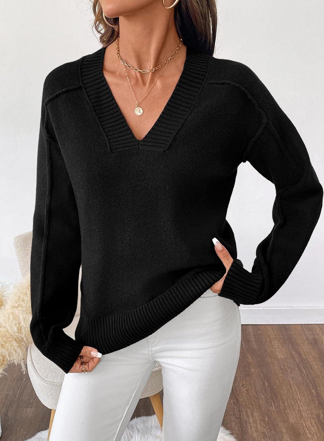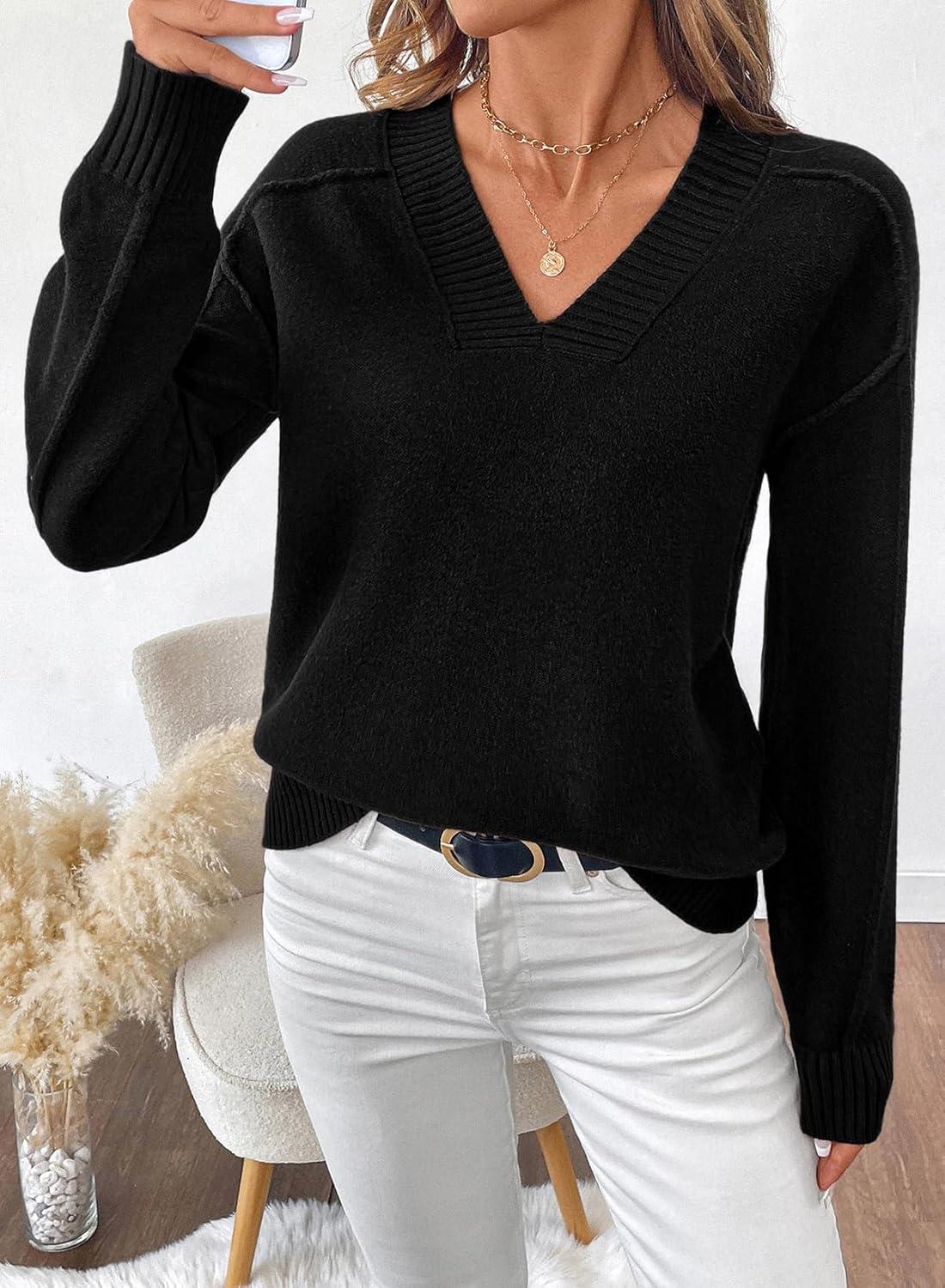 SHEWIN Womens Long Sleeve V Neck Sweaters Casual Loose Drop Shoulder Solid Knit Pullover Sweater Tops(Black)