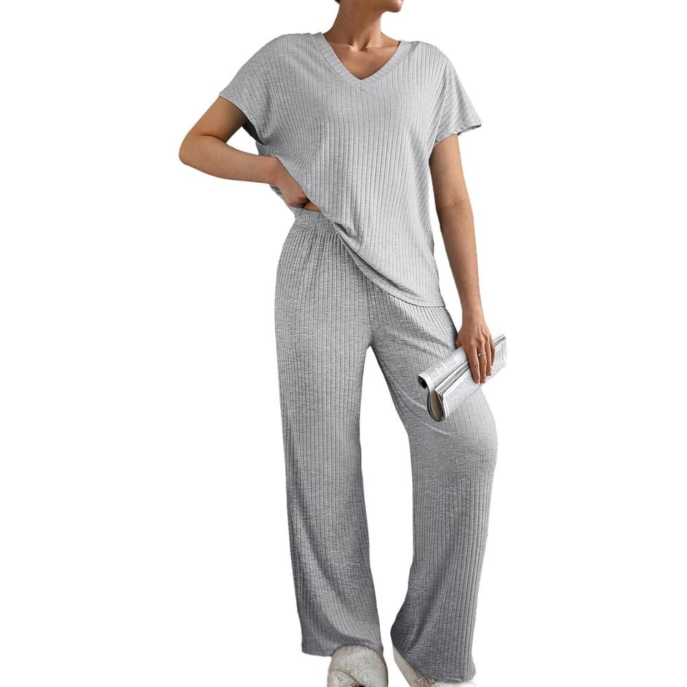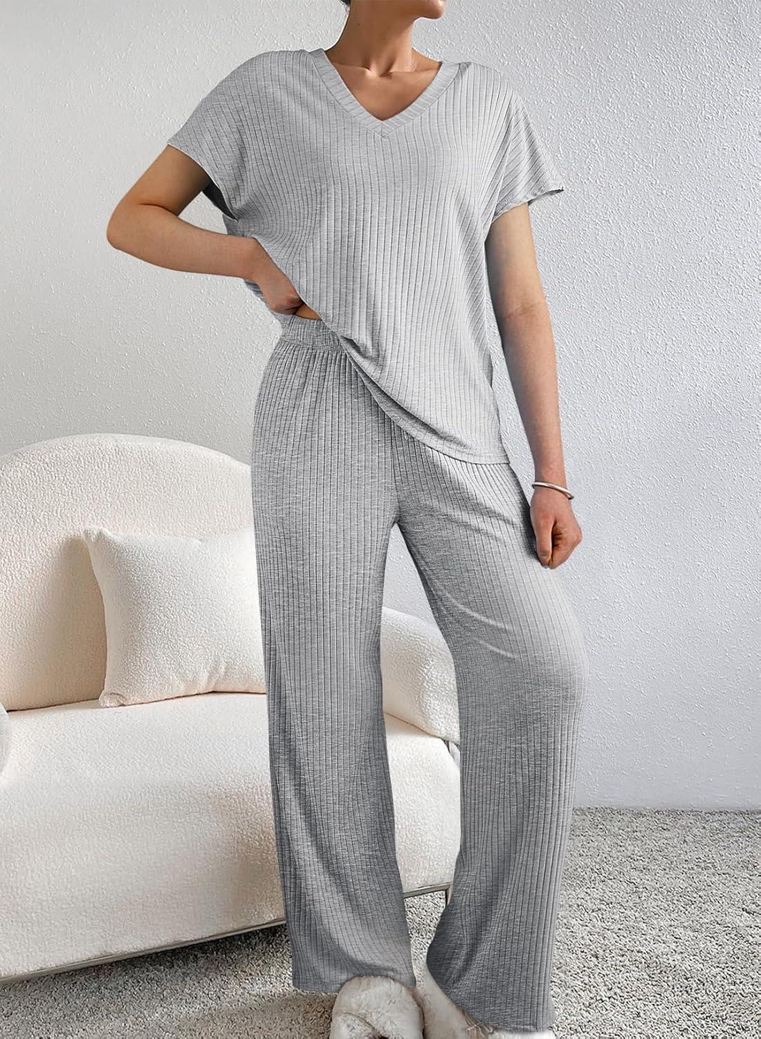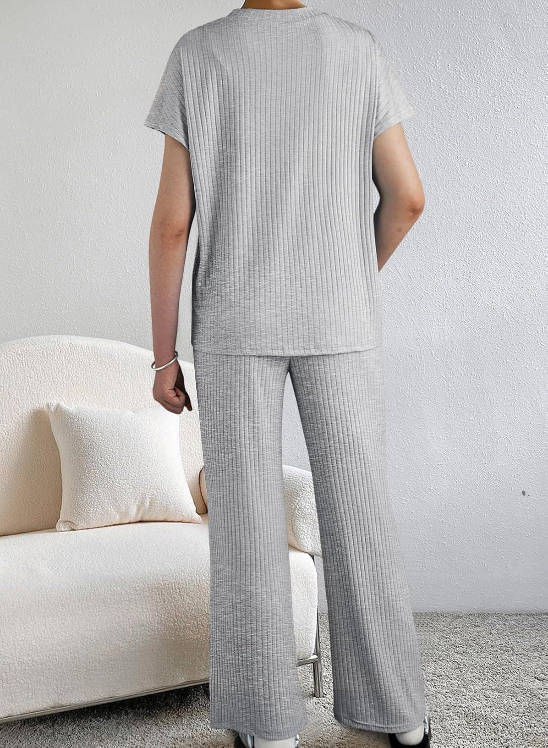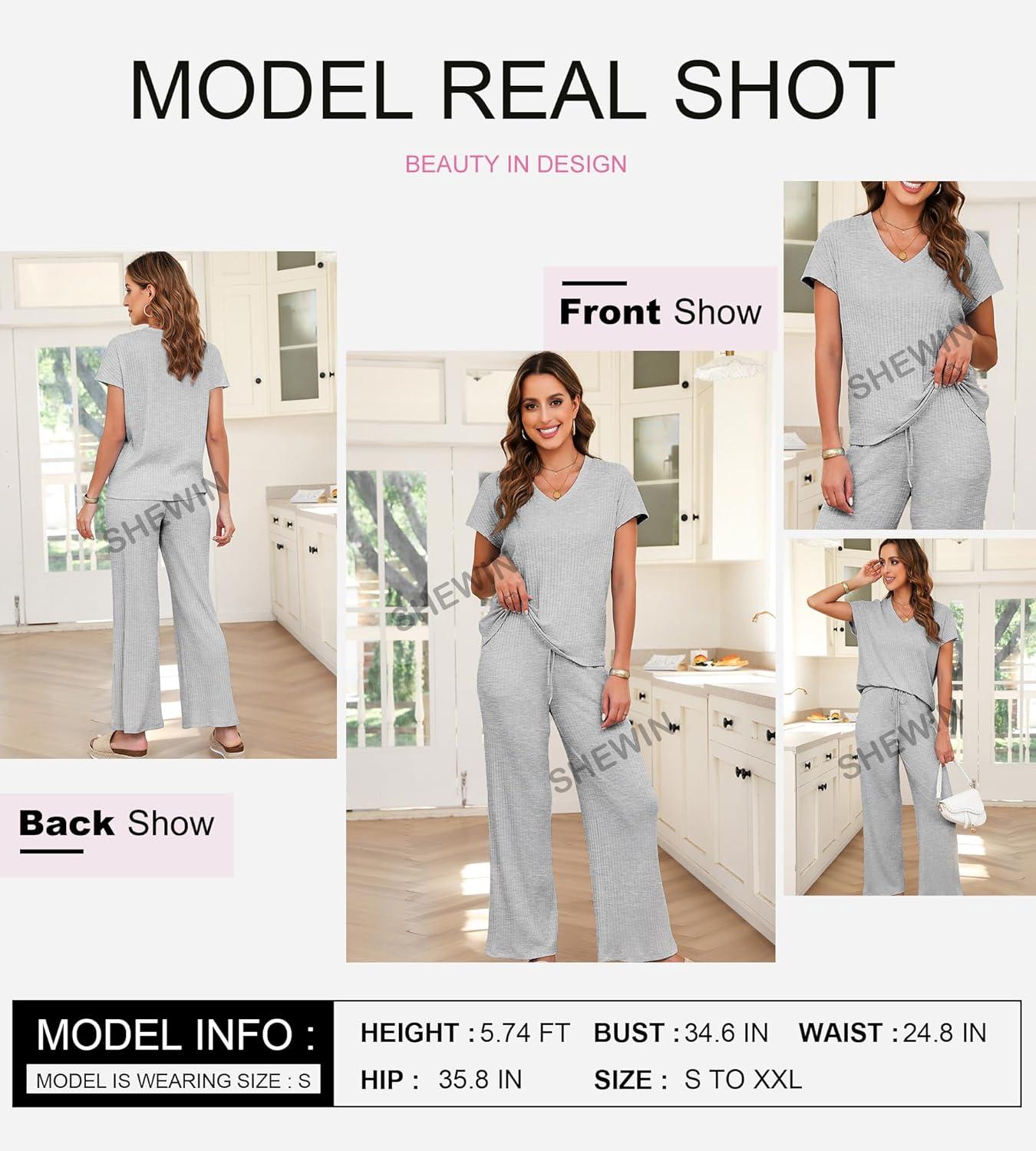 SHEWIN Women’s Pajama Sets Long Sleeve 2 Piece Lounge Sets Ribbed Knit Sweater Sleepwear(Grey)