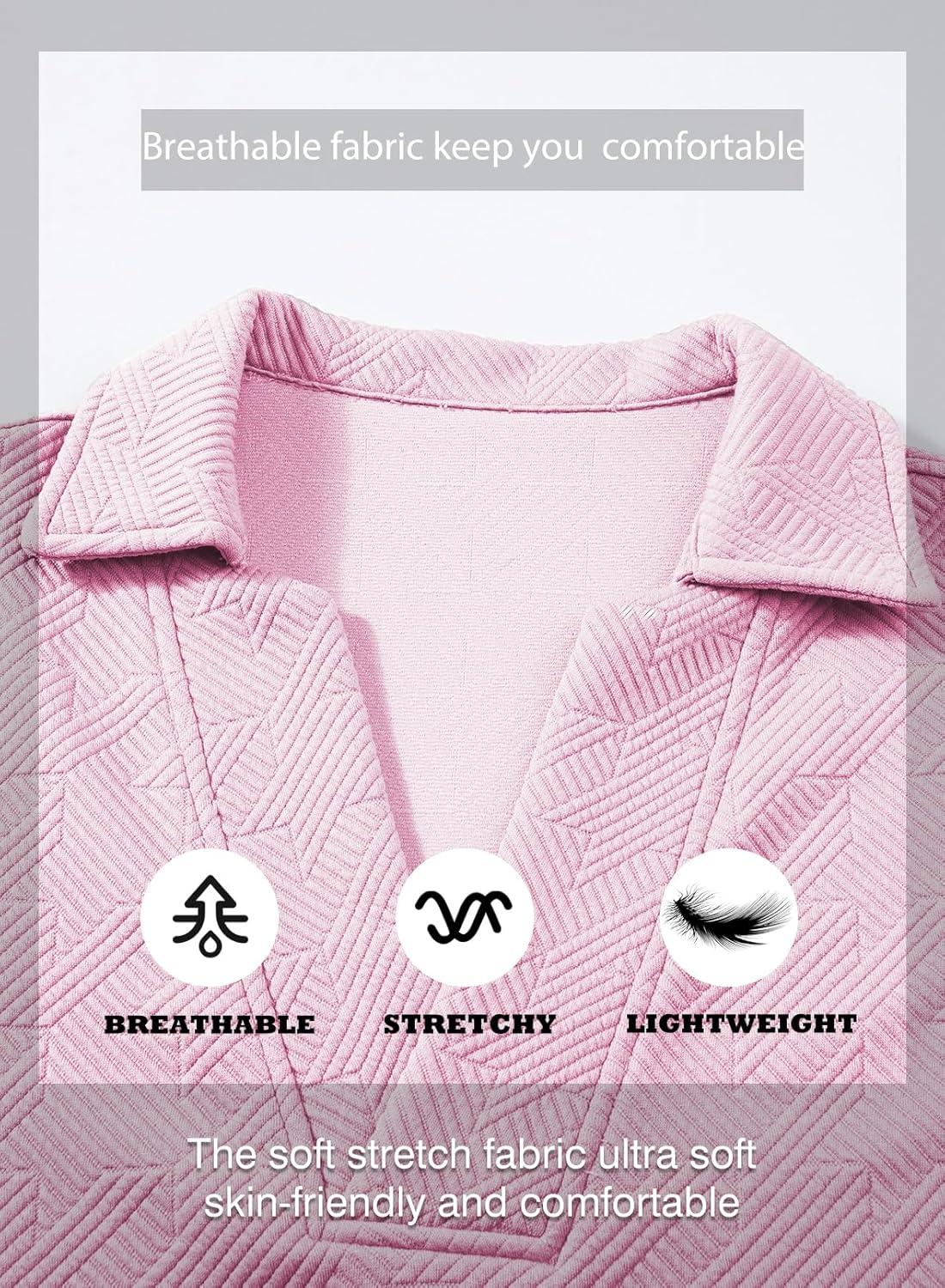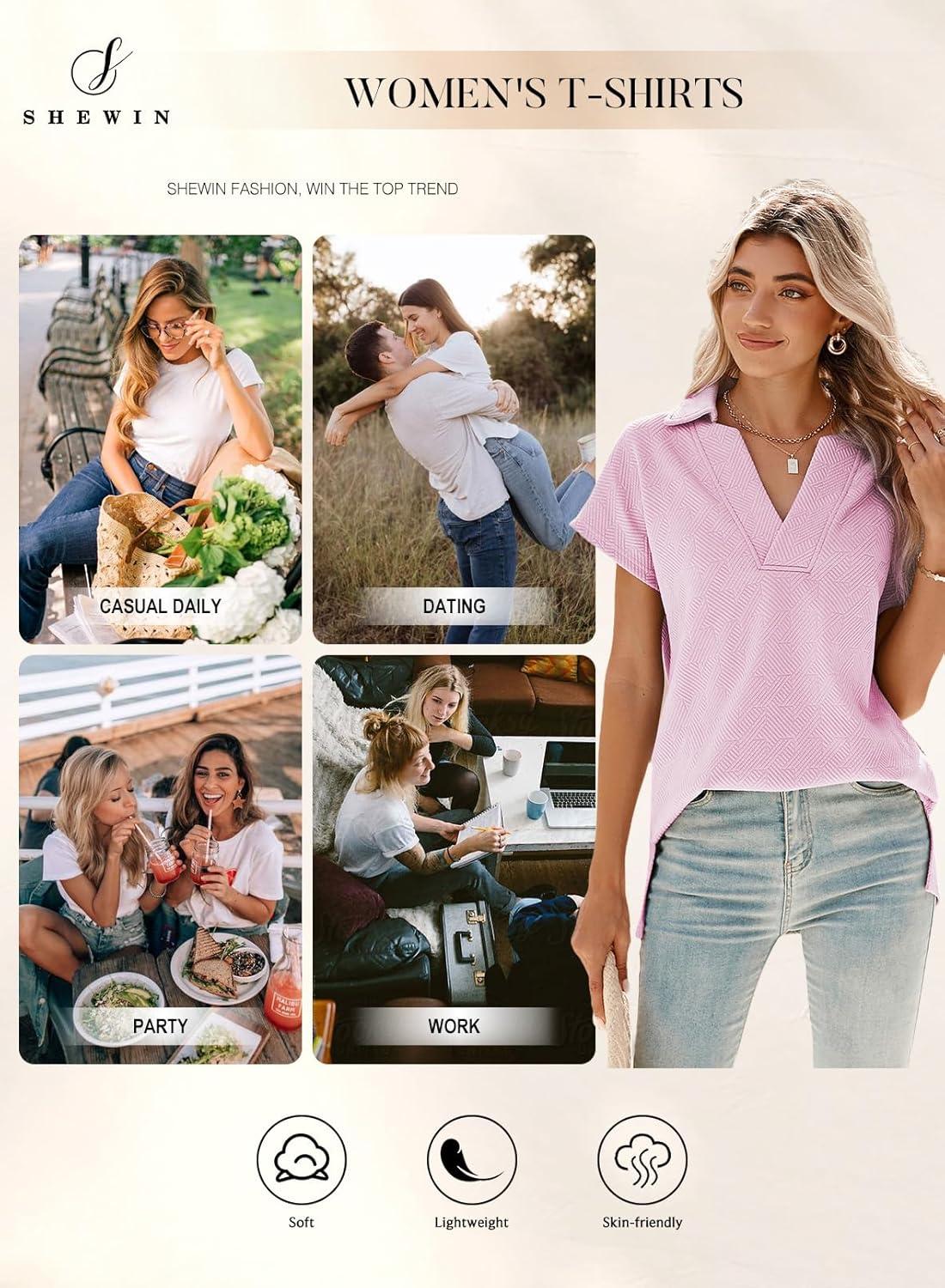 SHEWIN Women’s Polo Shirts Casual Collared V Neck Short Sleeve T Shirt Tunic Tops Loose Fit(B Pink)