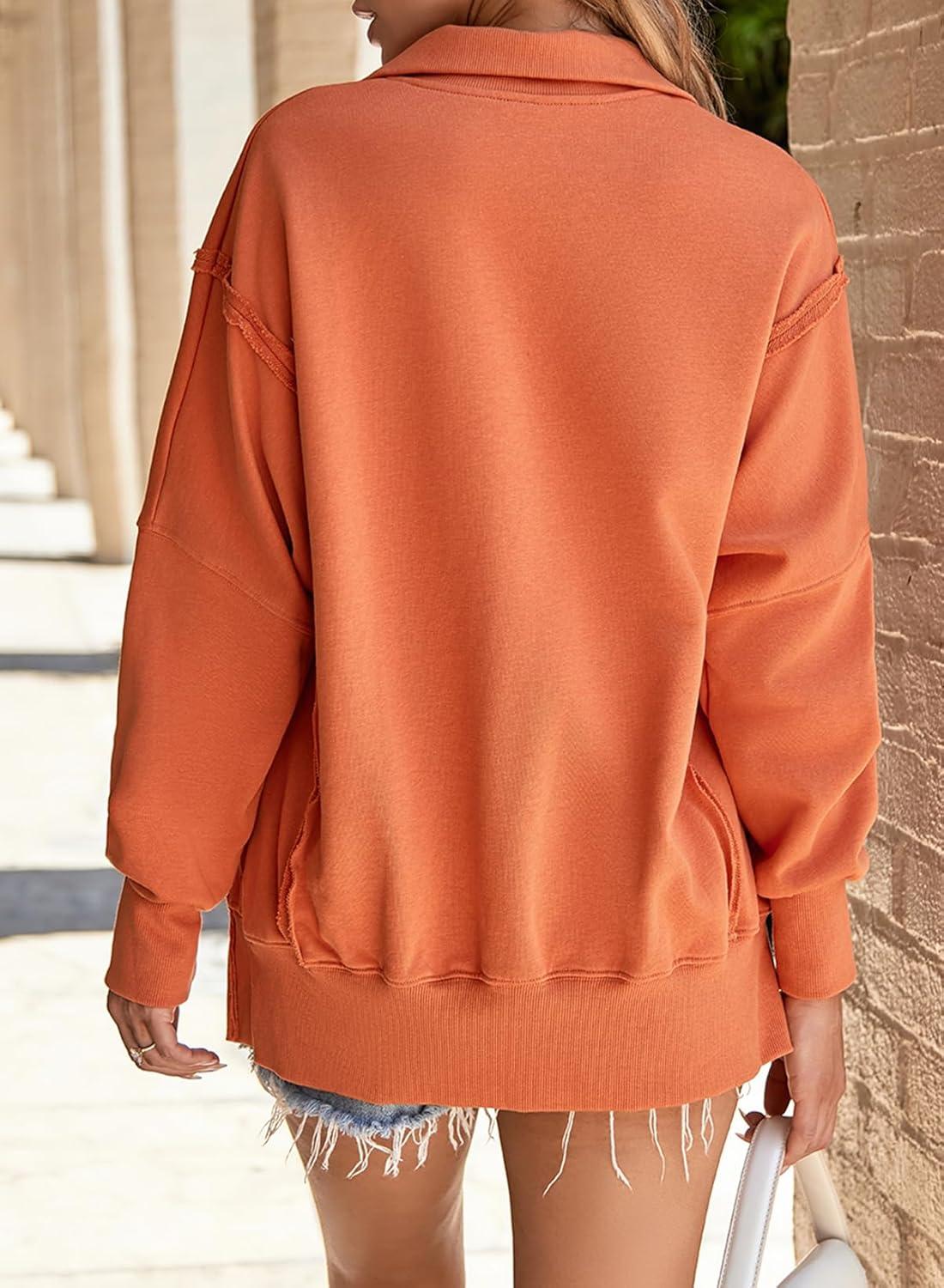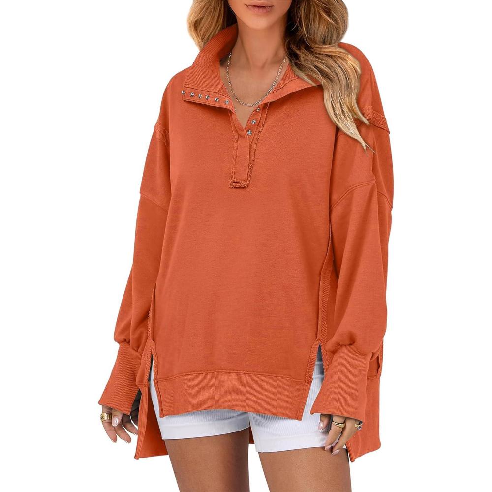 SHEWIN Womens Reverse Seam Snap-Button Henley Sweatshirt Casual Loose High Low Split Pullover Tops(Orange)