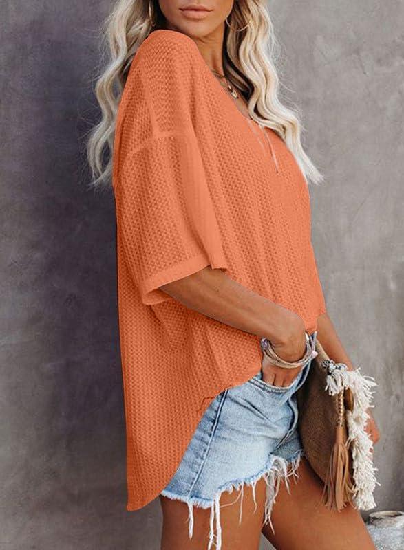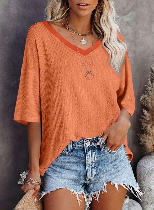 SHEWIN Womens Shirts Waffle Knit Tops for Women Short Sleeve V Neck T Shirts Summer Tops(B Orange)