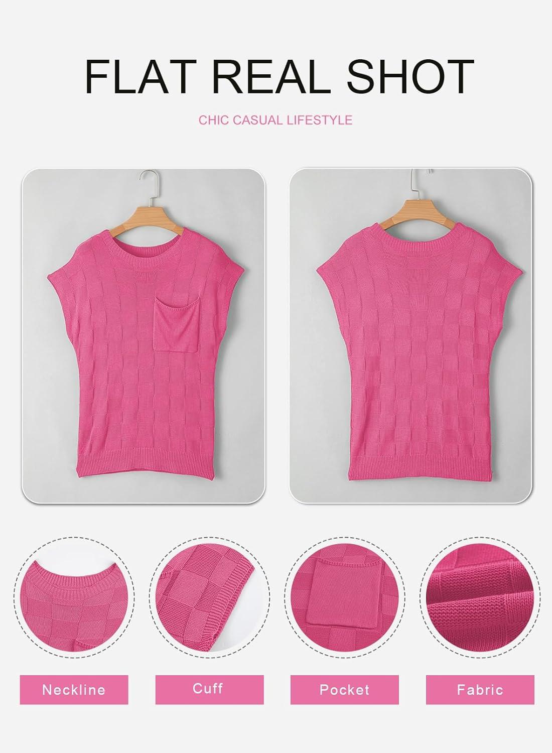 SHEWIN Womens Short Sleeve Sweater Casual Crewneck Summer Tops Lightweight Cap Sleeve Knit Sweater Vest Tops(Bright Pink)