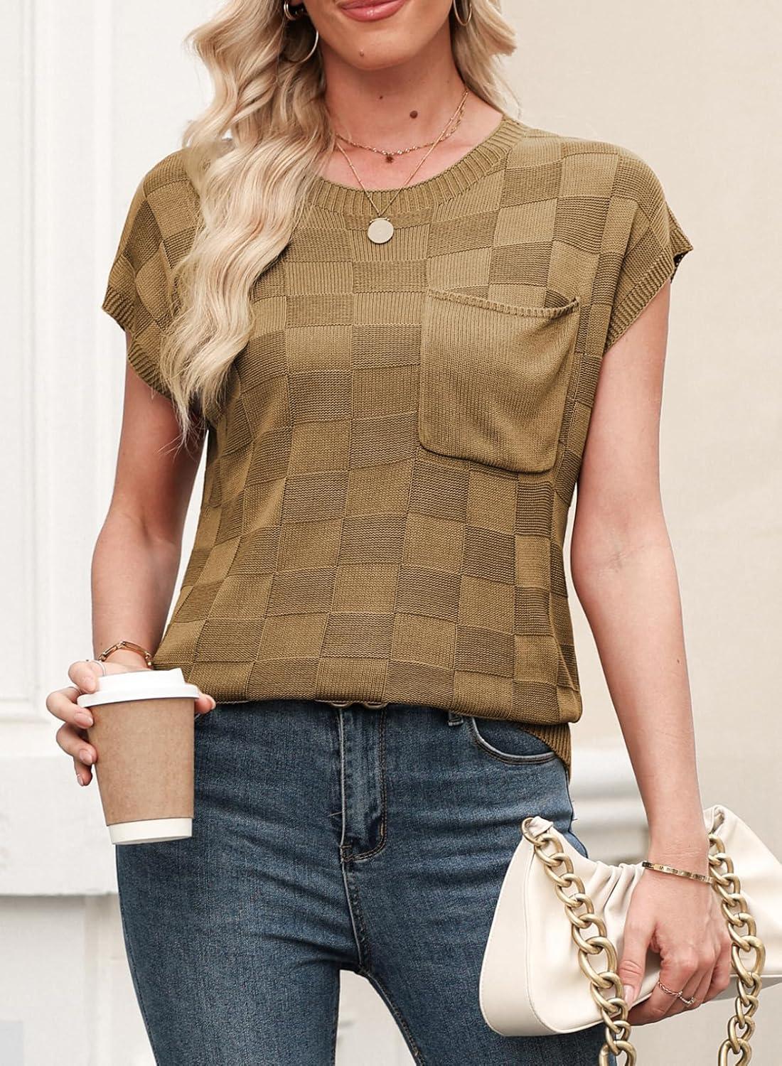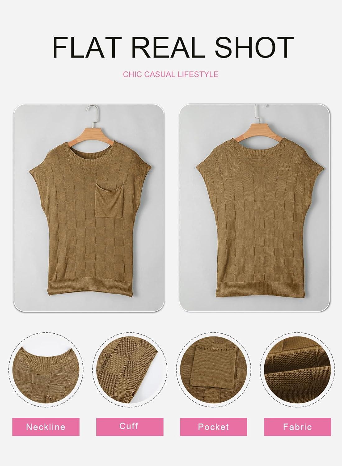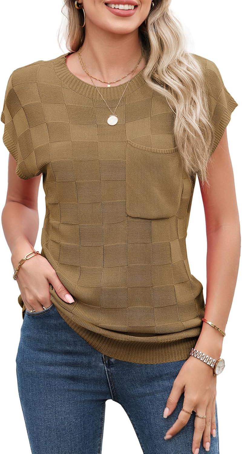SHEWIN Womens Short Sleeve Sweater Casual Crewneck Summer Tops Lightweight Cap Sleeve Knit Sweater Vest Tops(Camel)