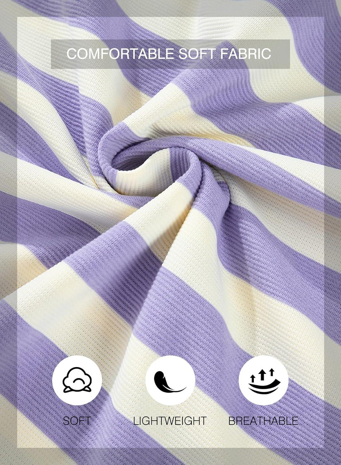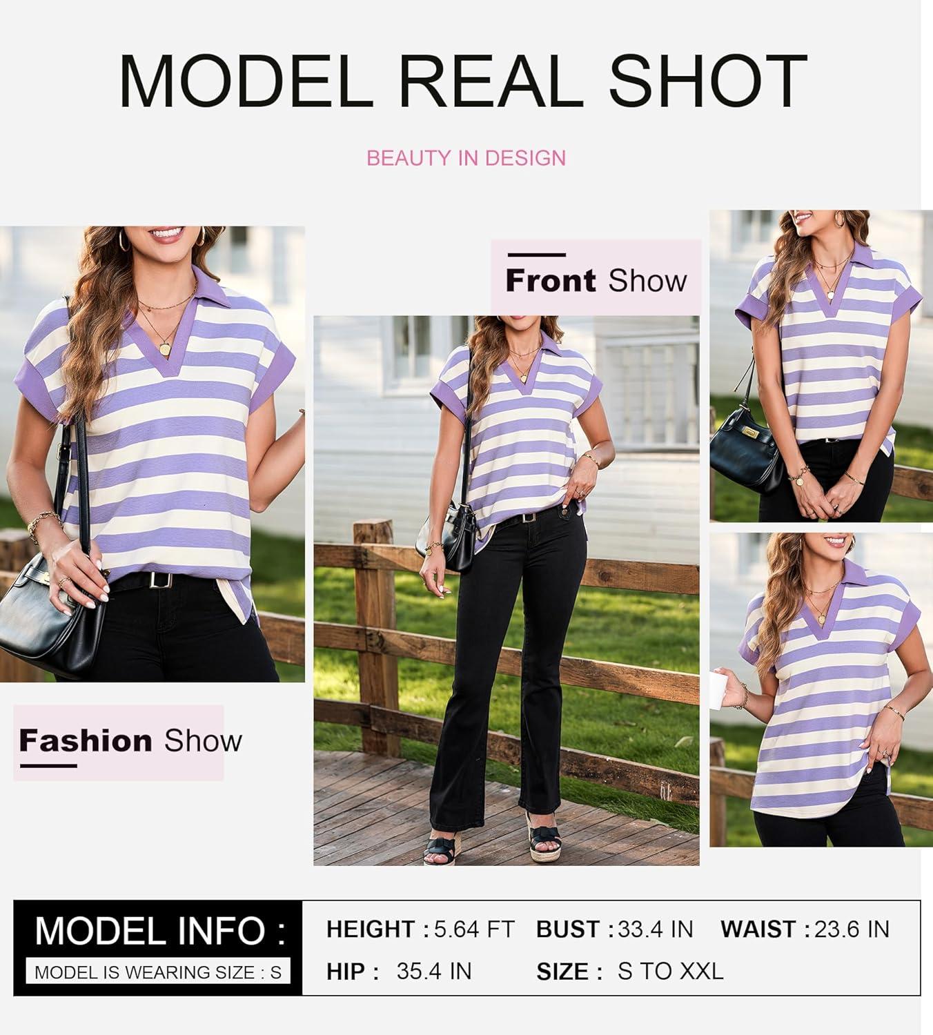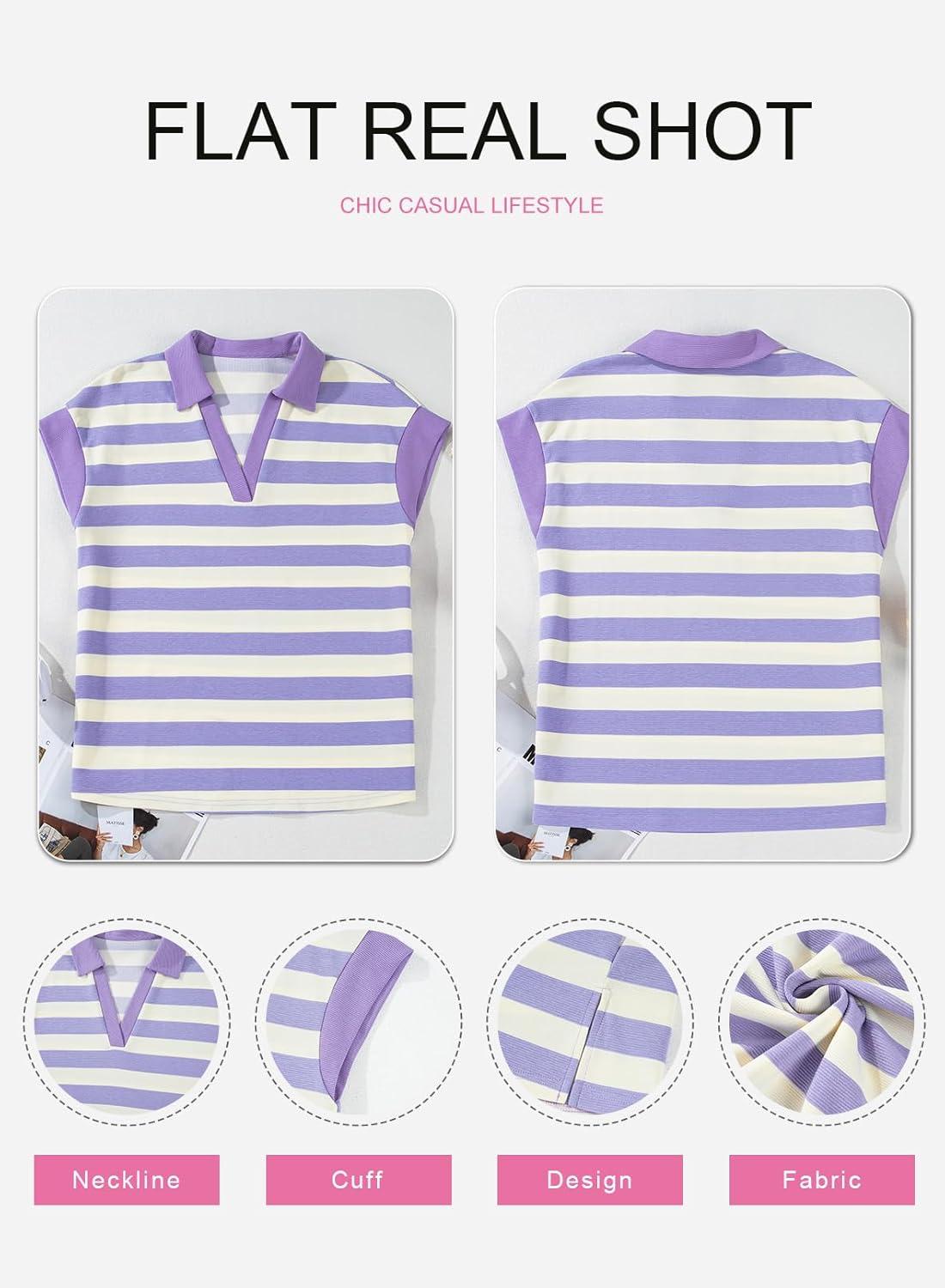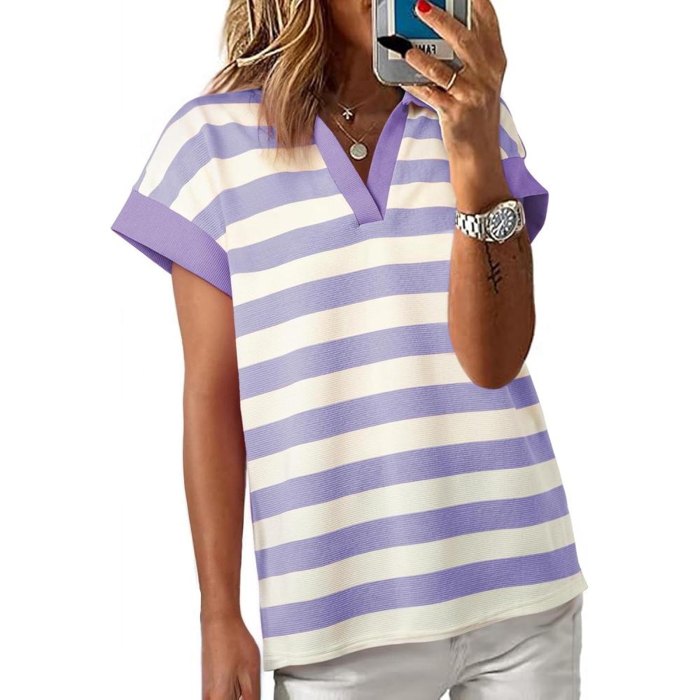 SHEWIN Womens Summer Tops Casual Short Sleeve Sweatshirt Color Block Striped Polo Shirts V Neck Pullover Tees Loose Blouses(Orchid Petal Stripe)