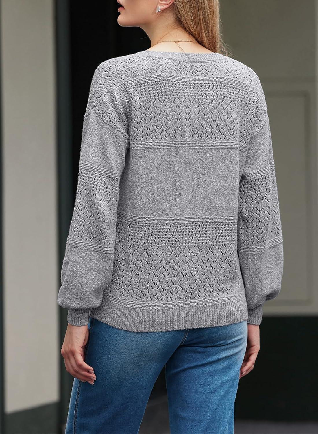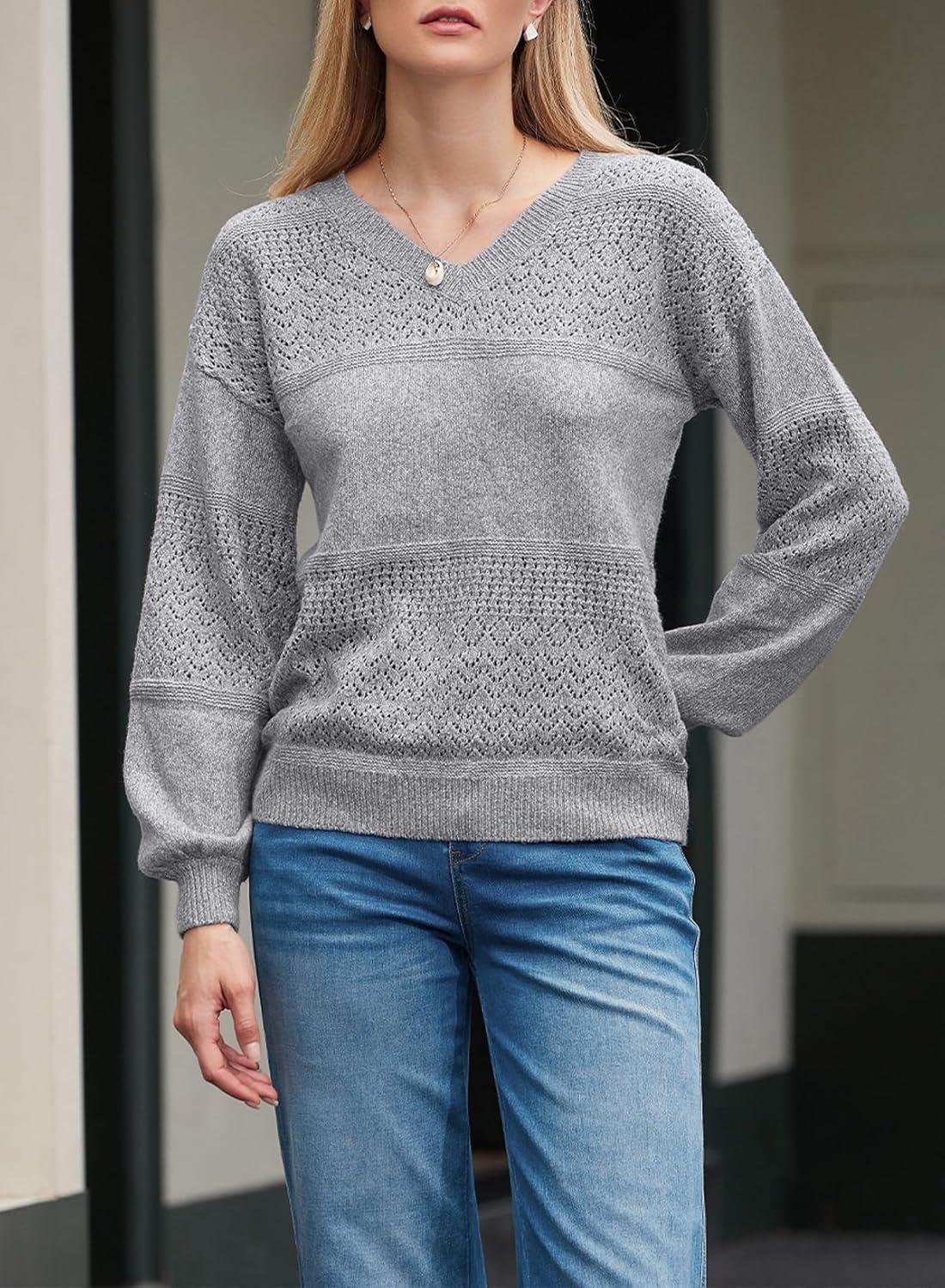 SHEWIN Women’s Sweaters Casual Long Sleeve V Neck Lightweight Crochet Pullover Sweater Tops(A Gray)