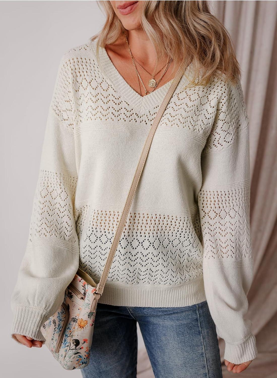 SHEWIN Women’s Sweaters Casual Long Sleeve V Neck Lightweight Crochet Pullover Sweater Tops(A White)