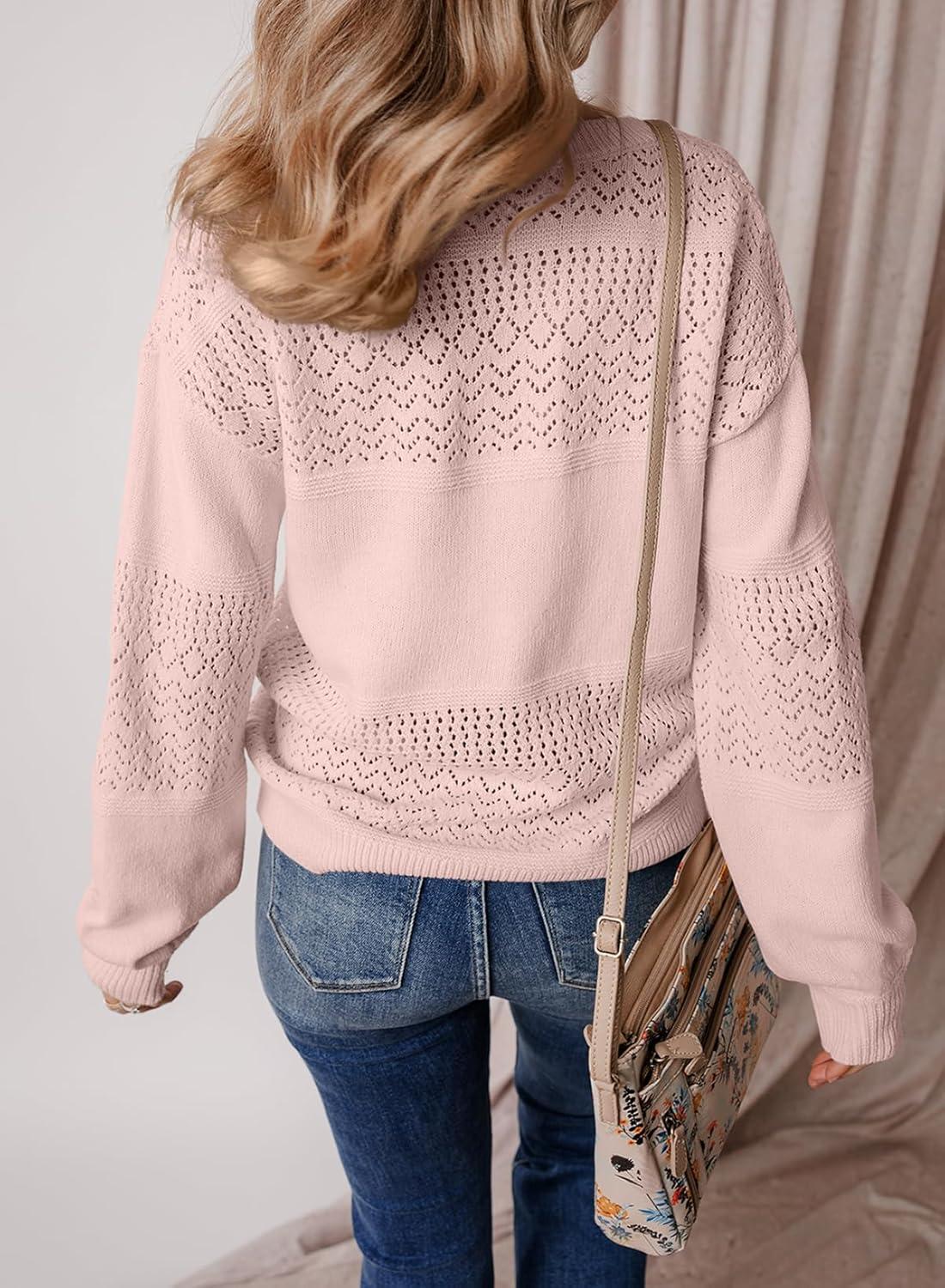 SHEWIN Women’s Sweaters Casual Long Sleeve V Neck Lightweight Crochet Pullover Sweater Tops(B Dusty Pink)