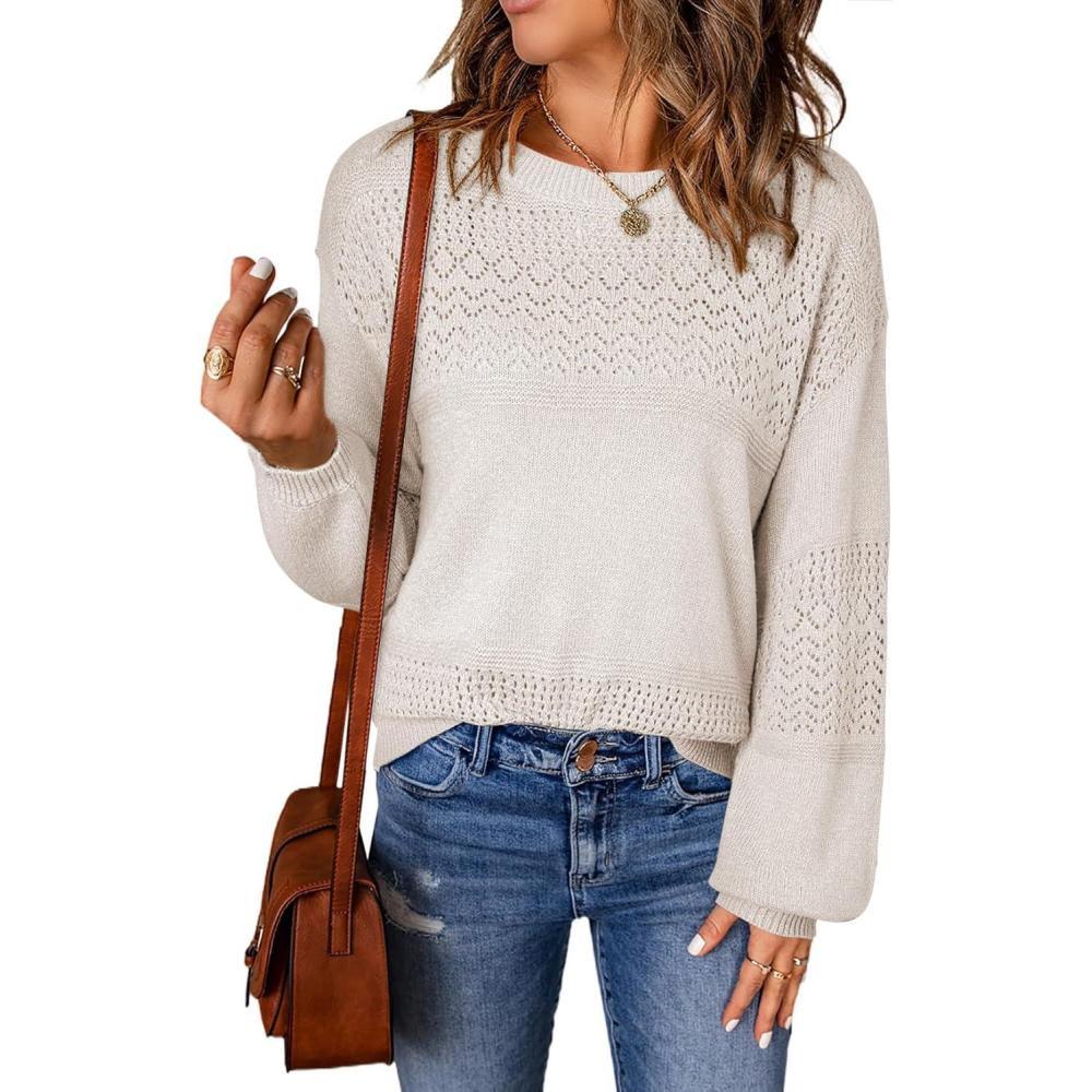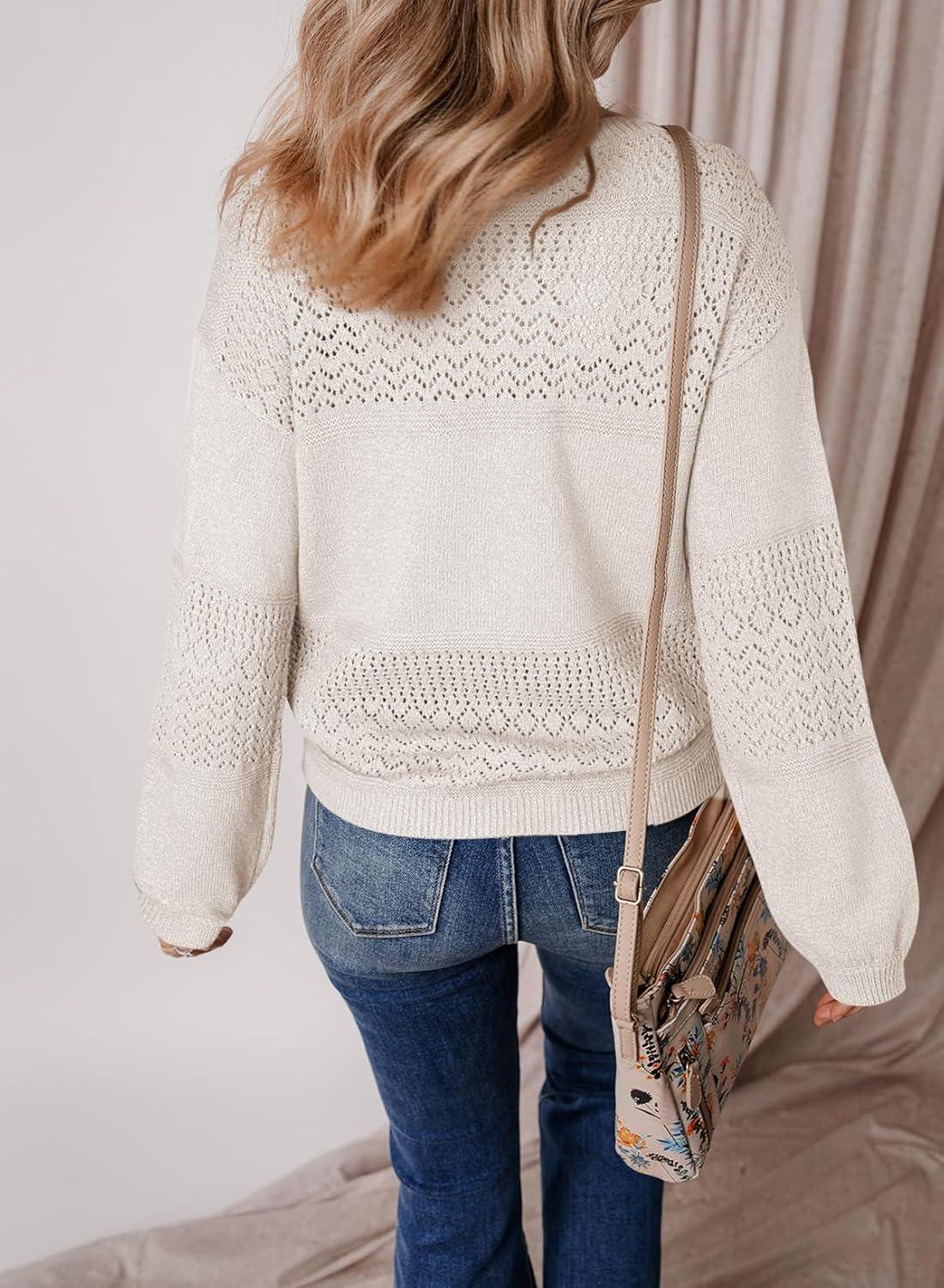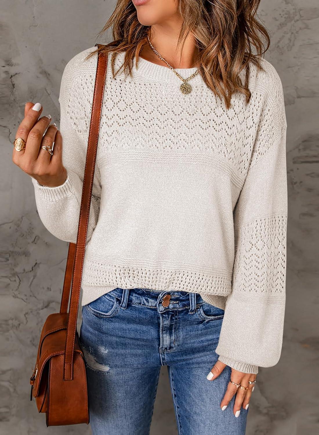 SHEWIN Women’s Sweaters Casual Long Sleeve V Neck Lightweight Crochet Pullover Sweater Tops(C Crewneck White)