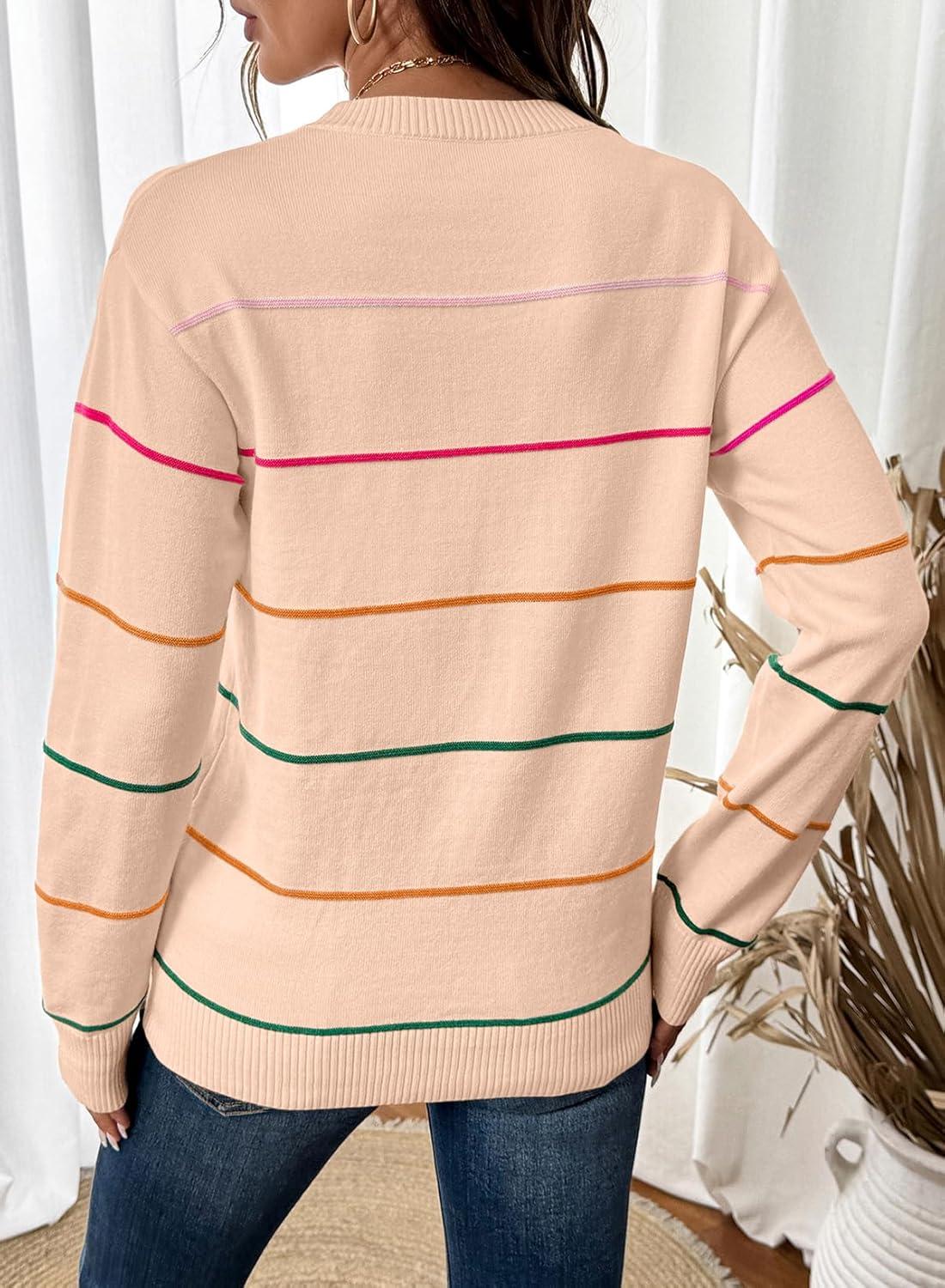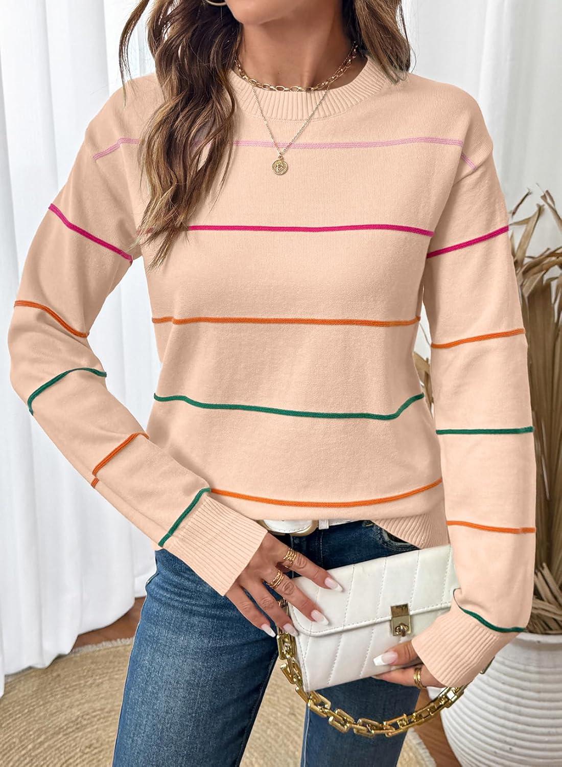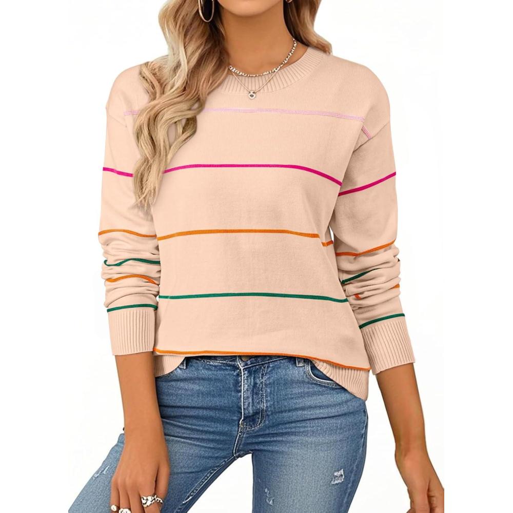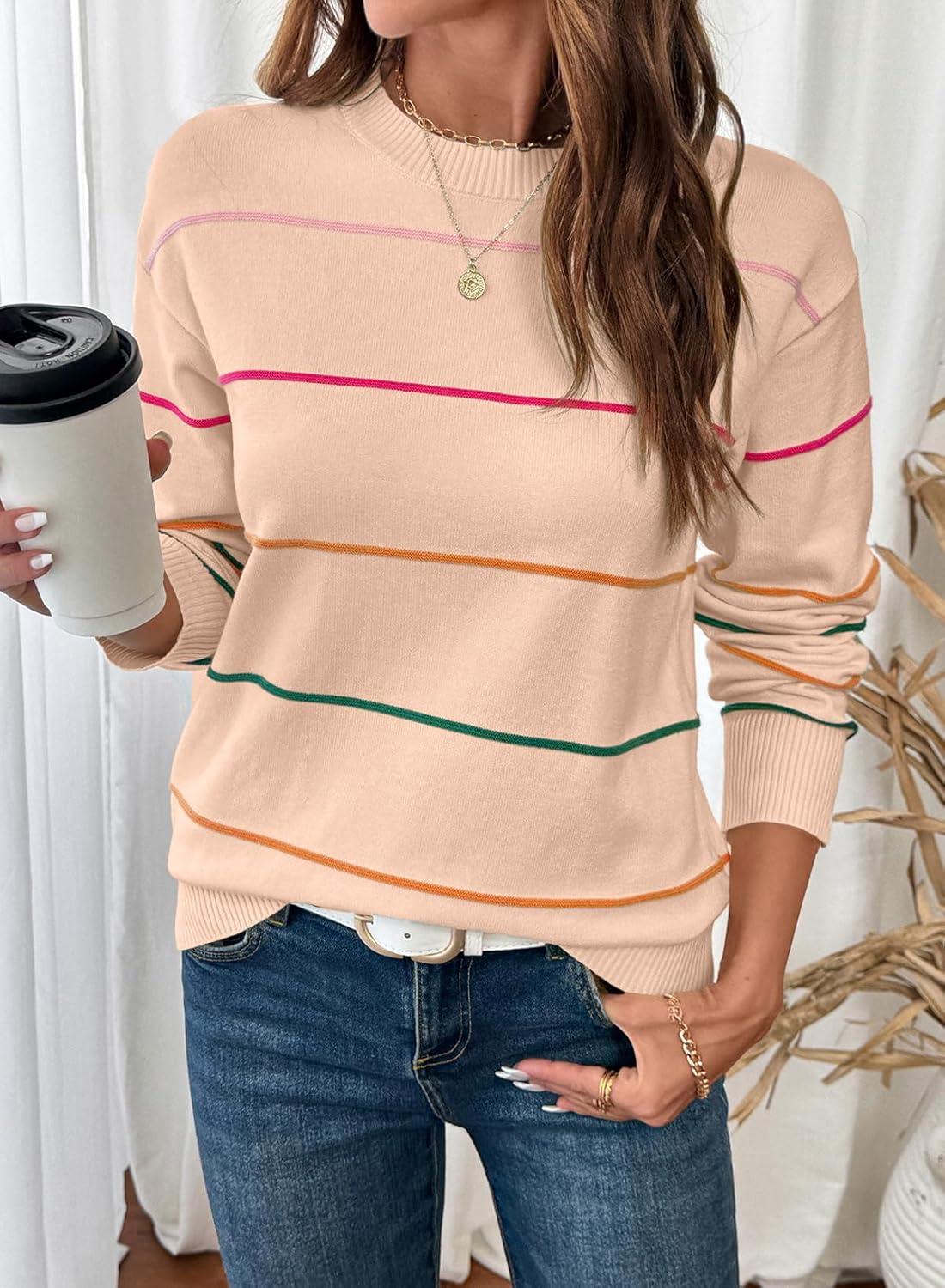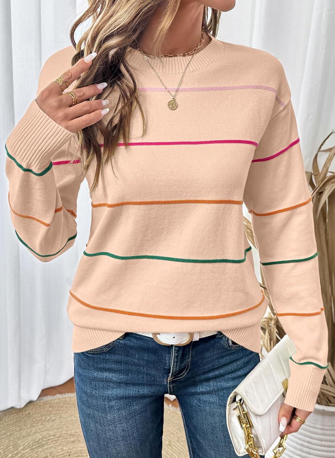SHEWIN Womens Sweaters Crew Neck Knit Long Sleeve Striped Sweater Fall Outfits for Women 2025(Apricot Pink)