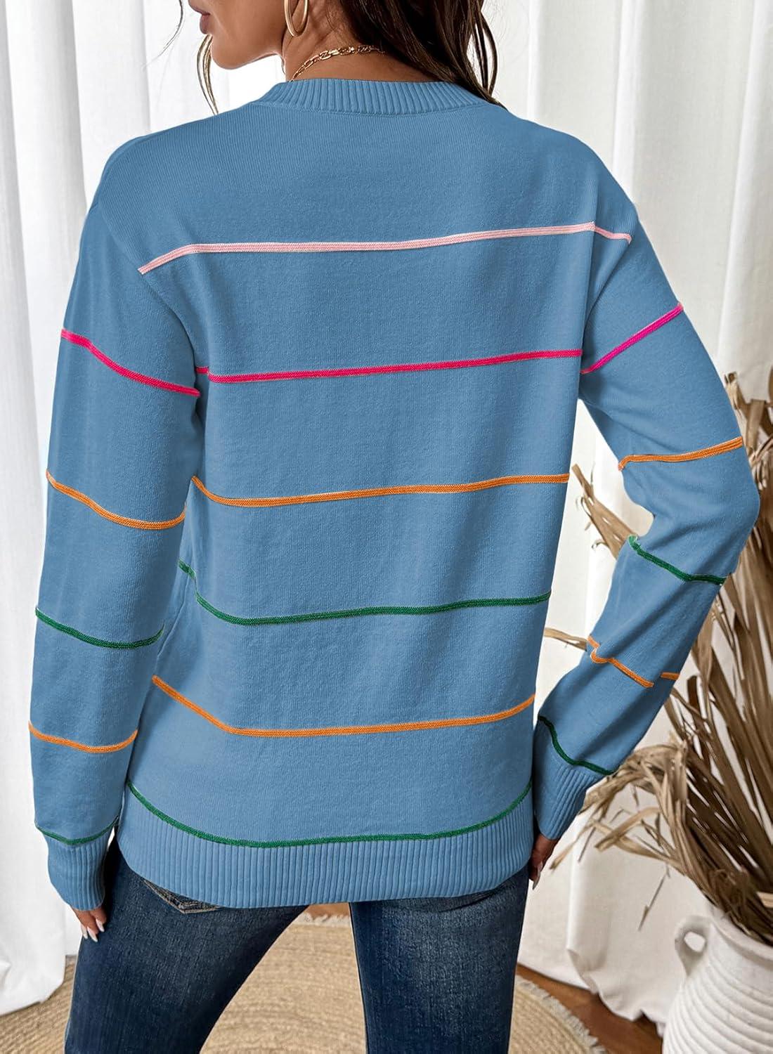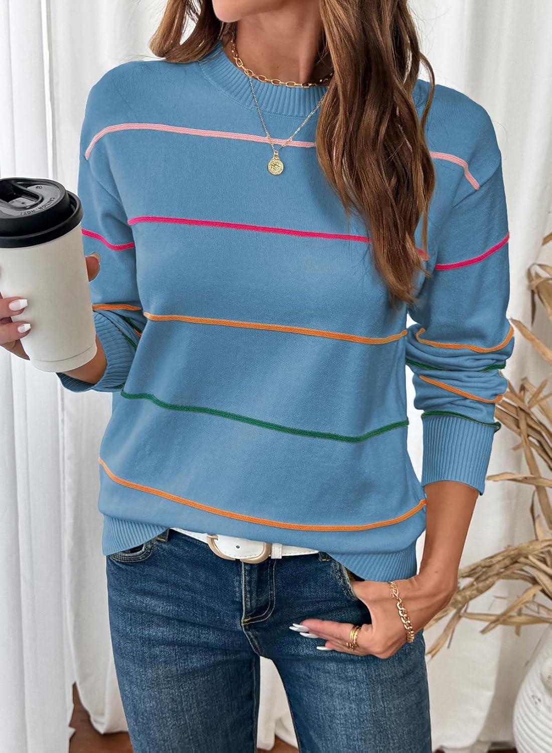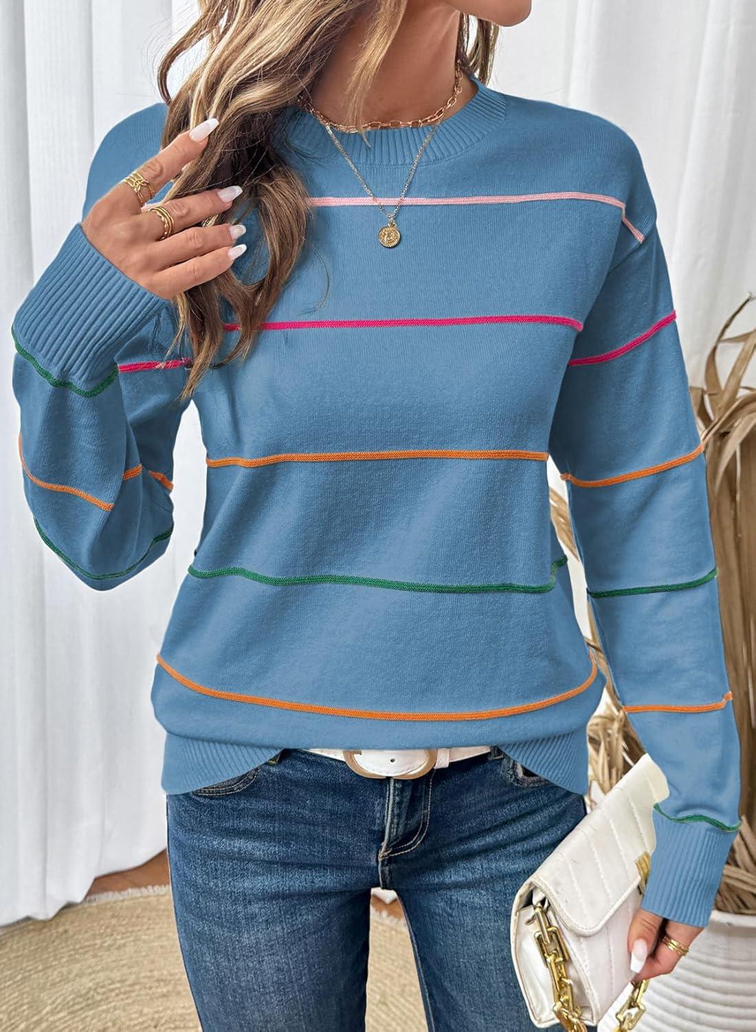 SHEWIN Womens Sweaters Crew Neck Knit Long Sleeve Striped Sweater Fall Outfits for Women 2025(Dusk Blue)