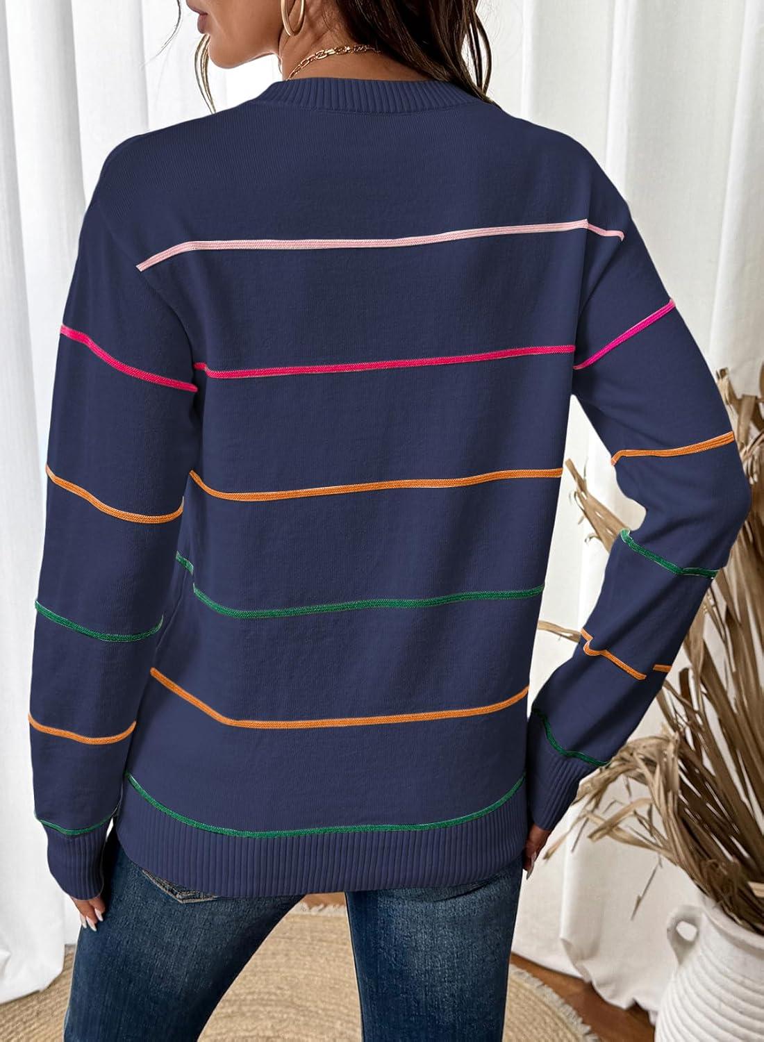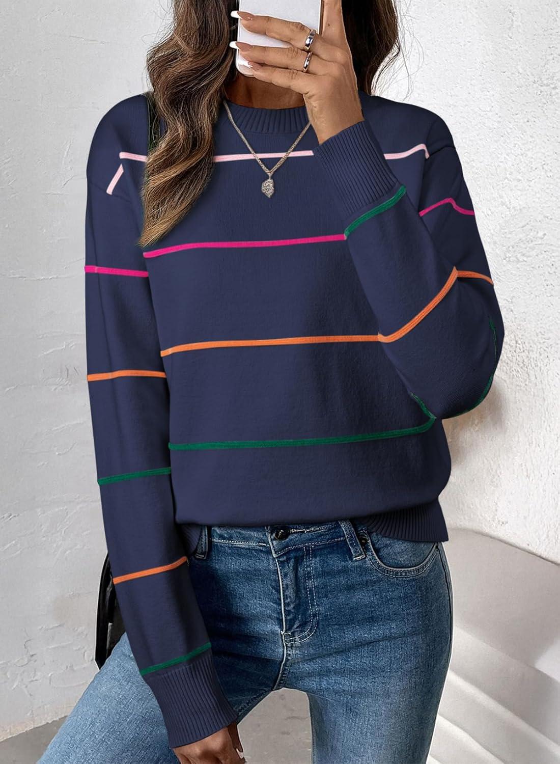 SHEWIN Womens Sweaters Crew Neck Knit Long Sleeve Striped Sweater Fall Outfits for Women 2025(Navy Blue)
