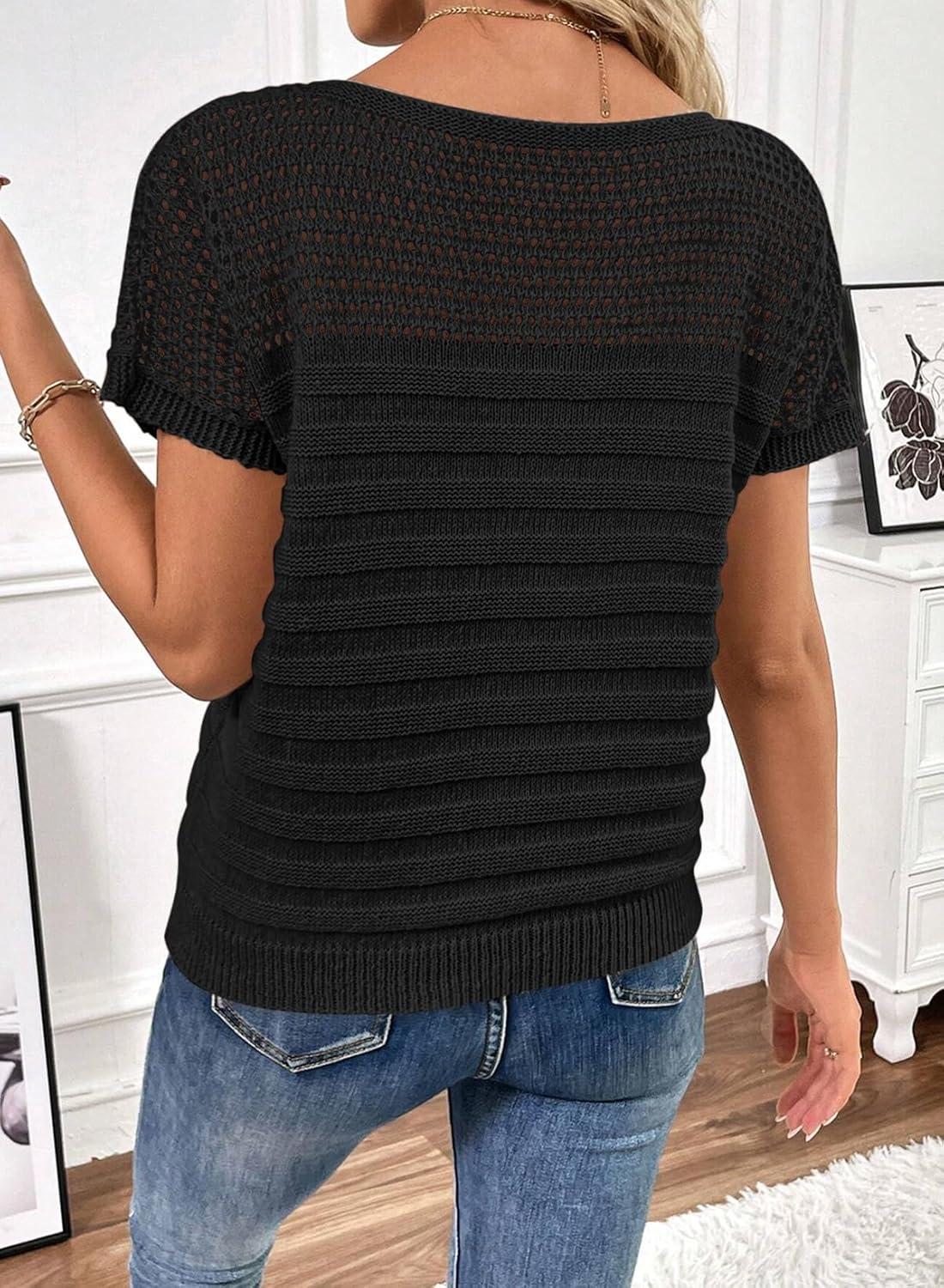 SHEWIN Womens Sweaters Crew Neck Short Sleeve Shirts Summer Tops Knit Hollow Out T Shirts Sweater Blouses(Black)
