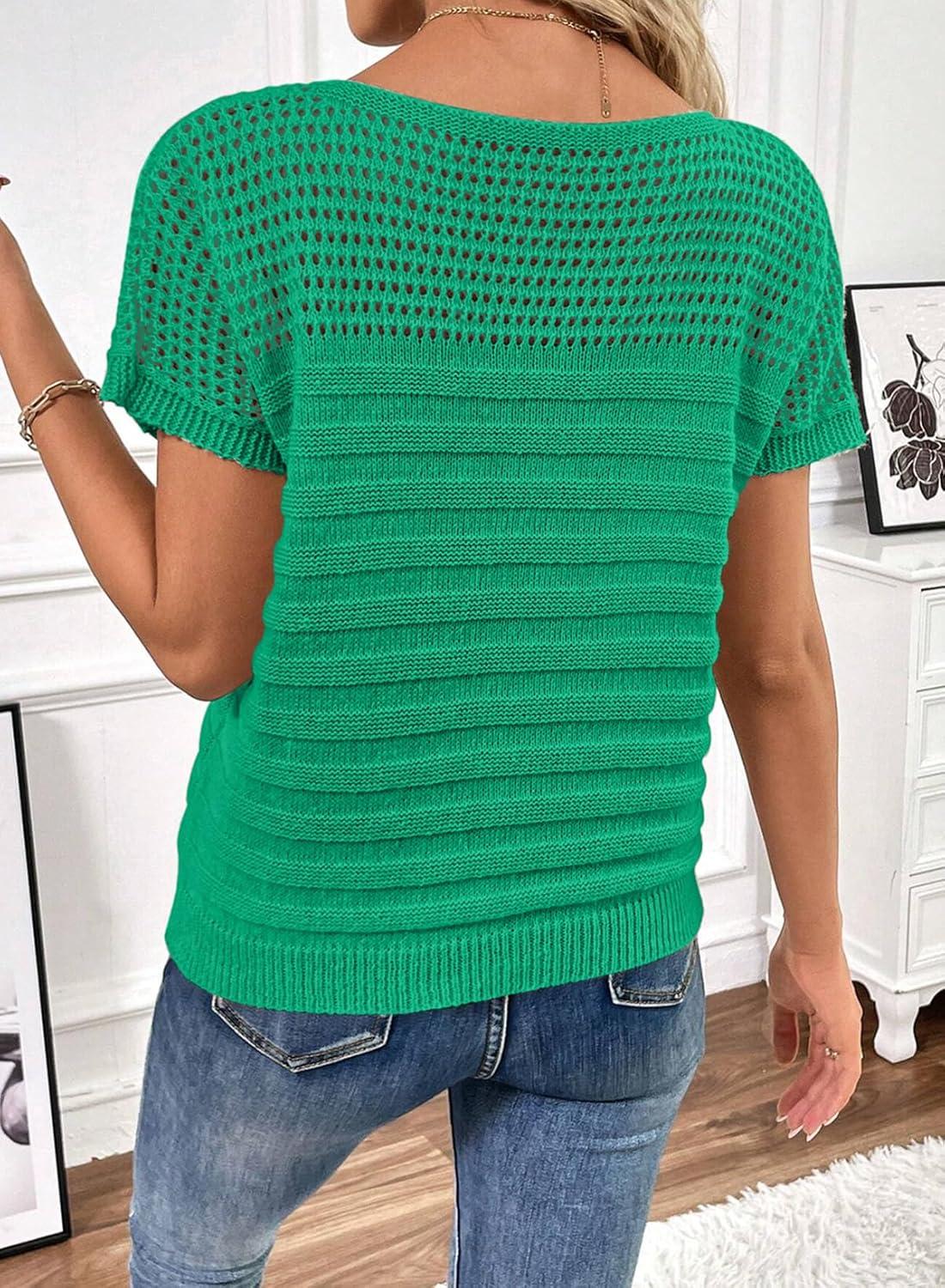 SHEWIN Womens Sweaters Crew Neck Short Sleeve Shirts Summer Tops Knit Hollow Out T Shirts Sweater Blouses(Bright Green)