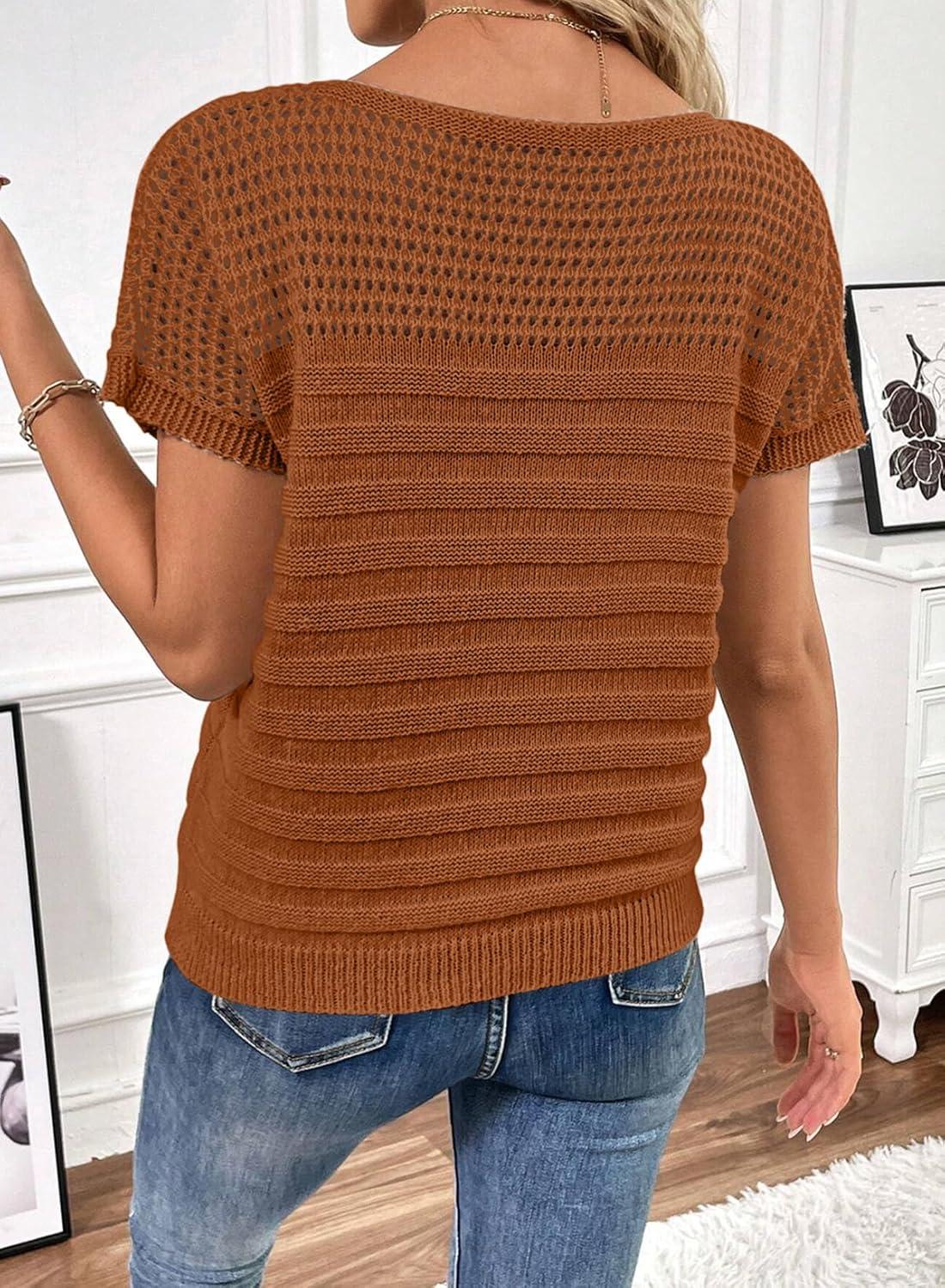 SHEWIN Womens Sweaters Crew Neck Short Sleeve Shirts Summer Tops Knit Hollow Out T Shirts Sweater Blouses(Cinnamon)