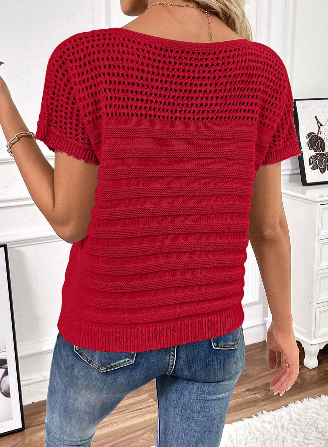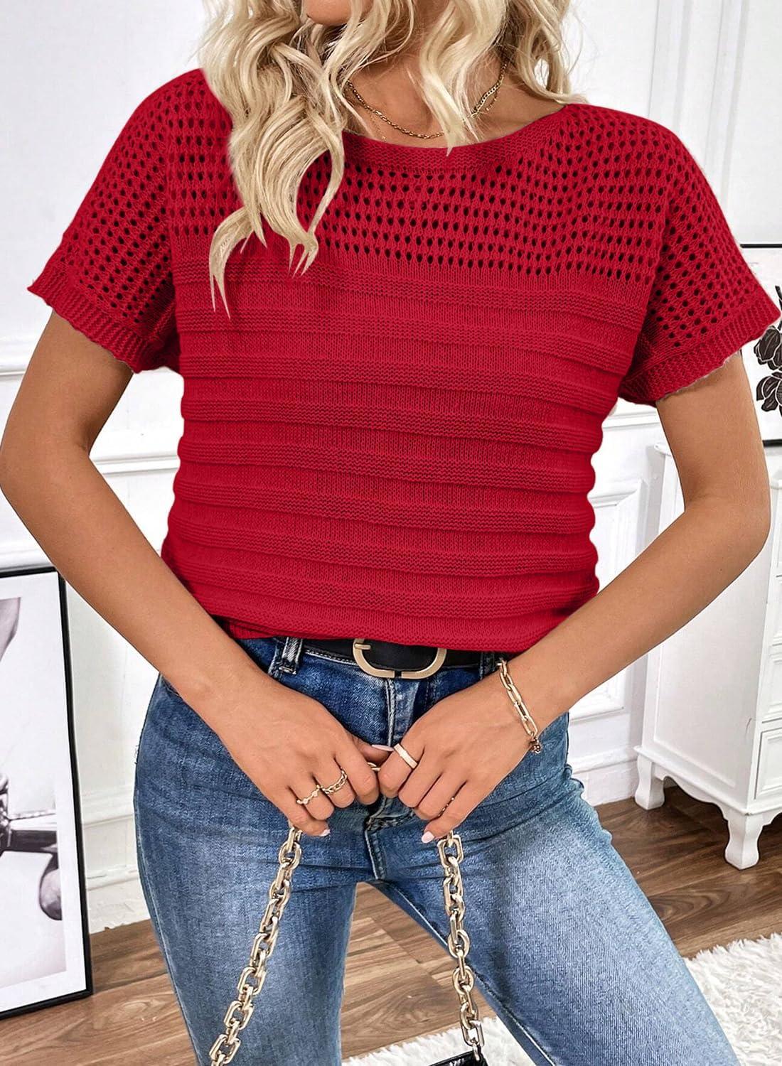 SHEWIN Womens Sweaters Crew Neck Short Sleeve Shirts Summer Tops Knit Hollow Out T Shirts Sweater Blouses(Racing Red)