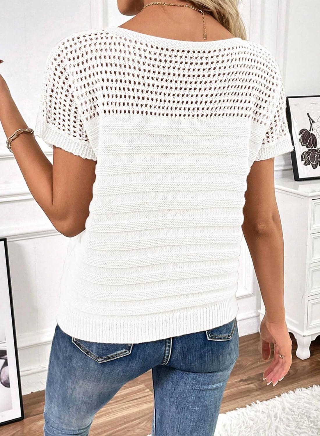 SHEWIN Womens Sweaters Crew Neck Short Sleeve Shirts Summer Tops Knit Hollow Out T Shirts Sweater Blouses(White)