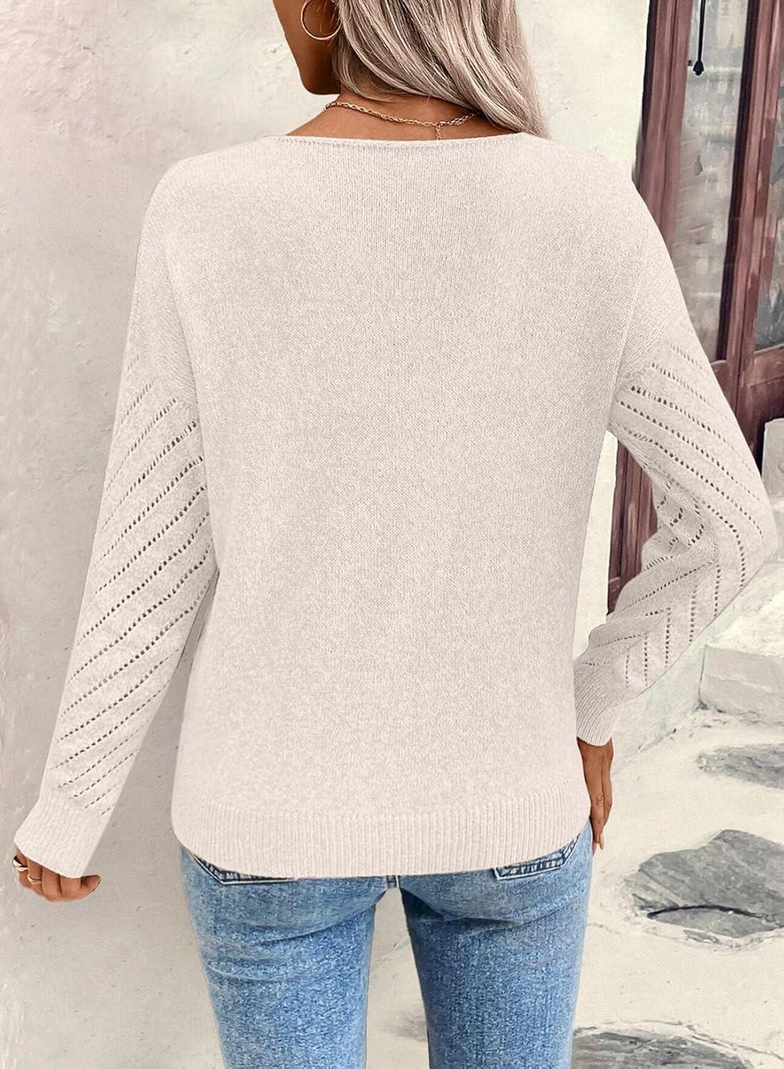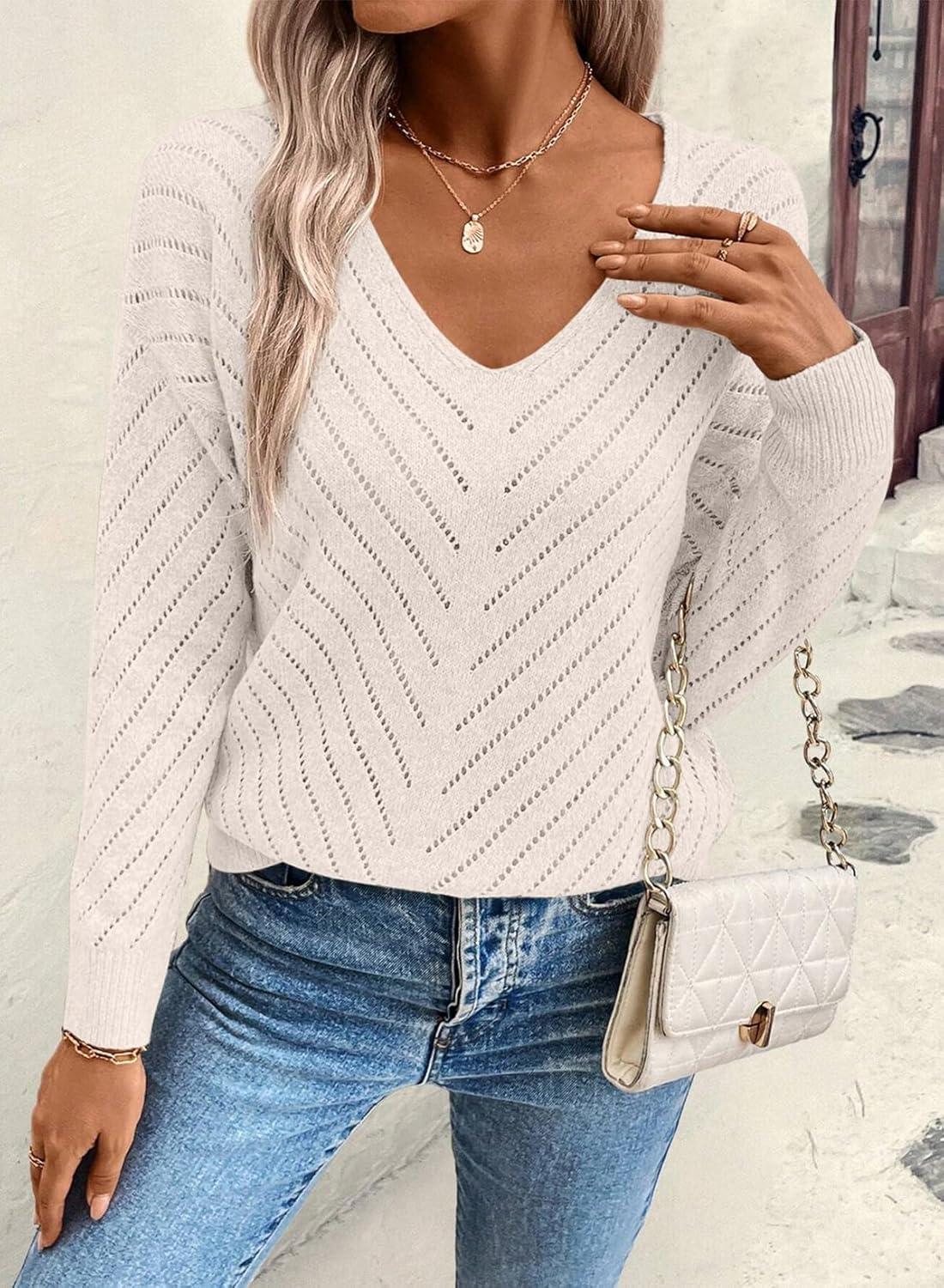 SHEWIN Women’s Sweaters Casual Long Sleeve V Neck Lightweight Crochet Pullover Sweater Tops