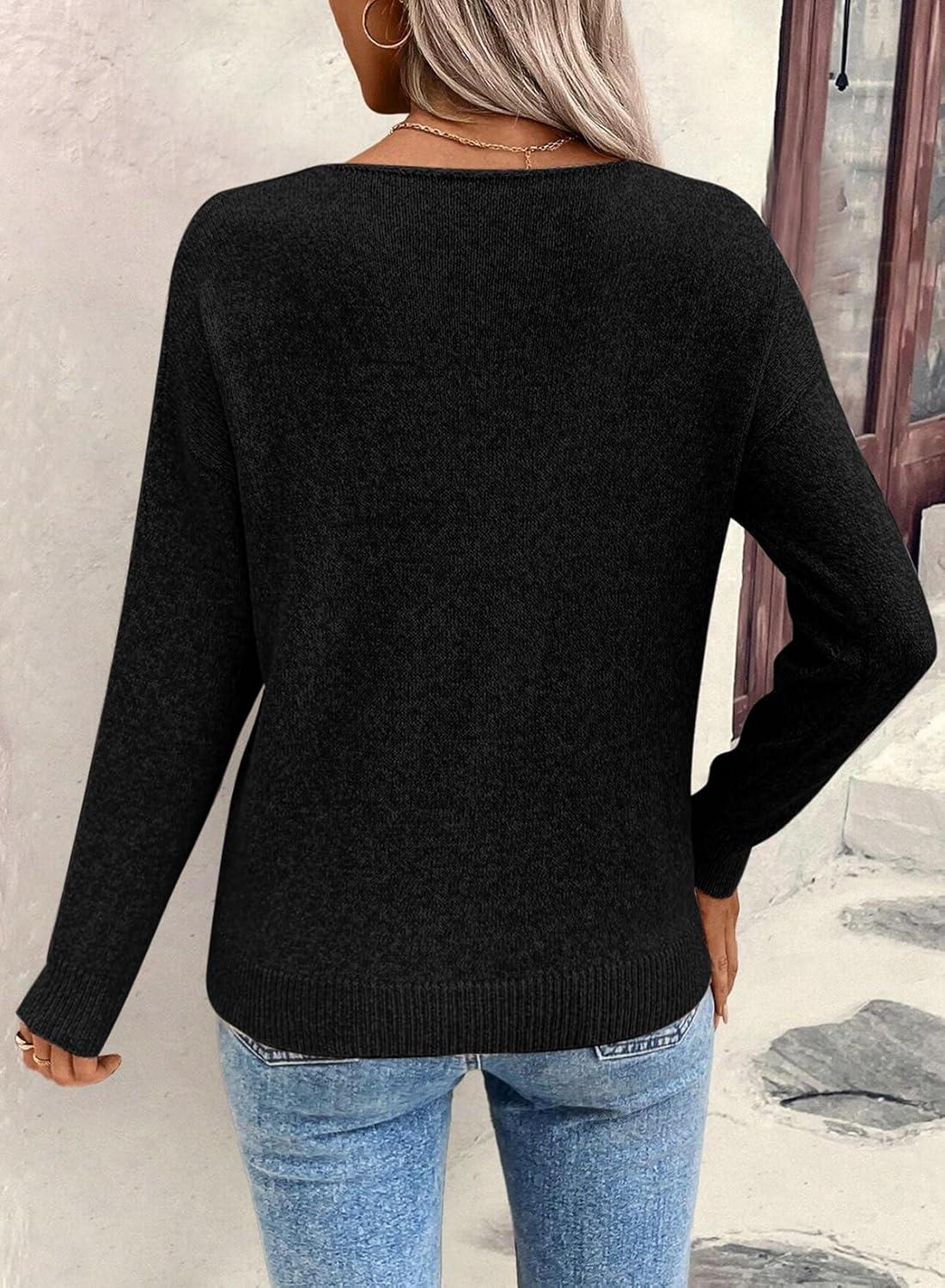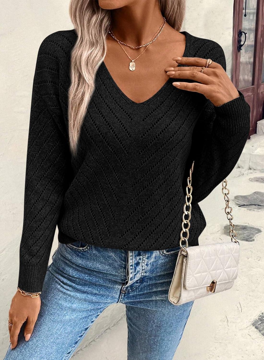 SHEWIN Womens Sweaters V Neck Long Sleeve Shirts Knit Hollow Out Crochet Sweater Fall Outfits for Women 2025(Black)
