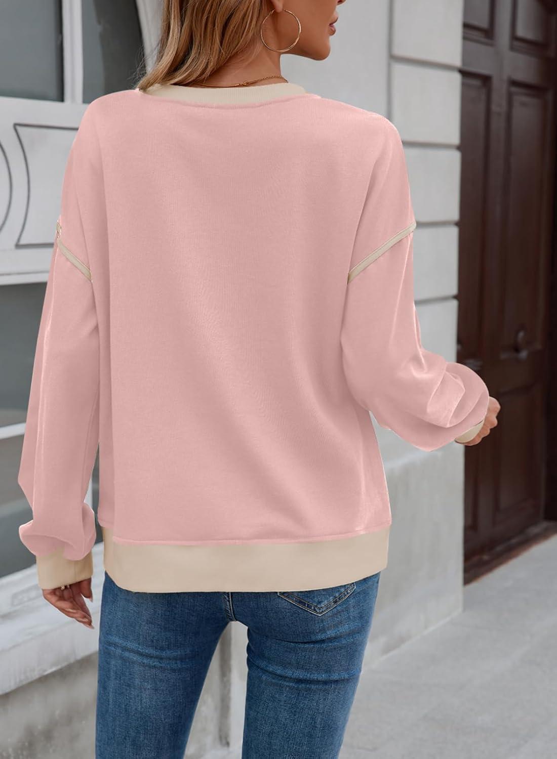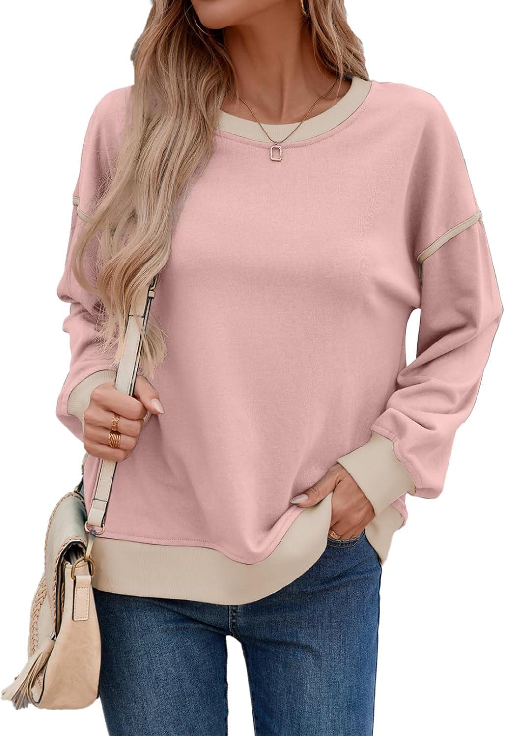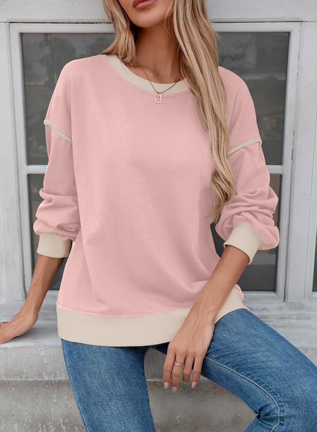 SHEWIN Womens Sweatshirt Casual Long Sleeve Lightweight Crewneck Sweatshirts Loose Solid Contrast Trim Pullover Tops(Pink)