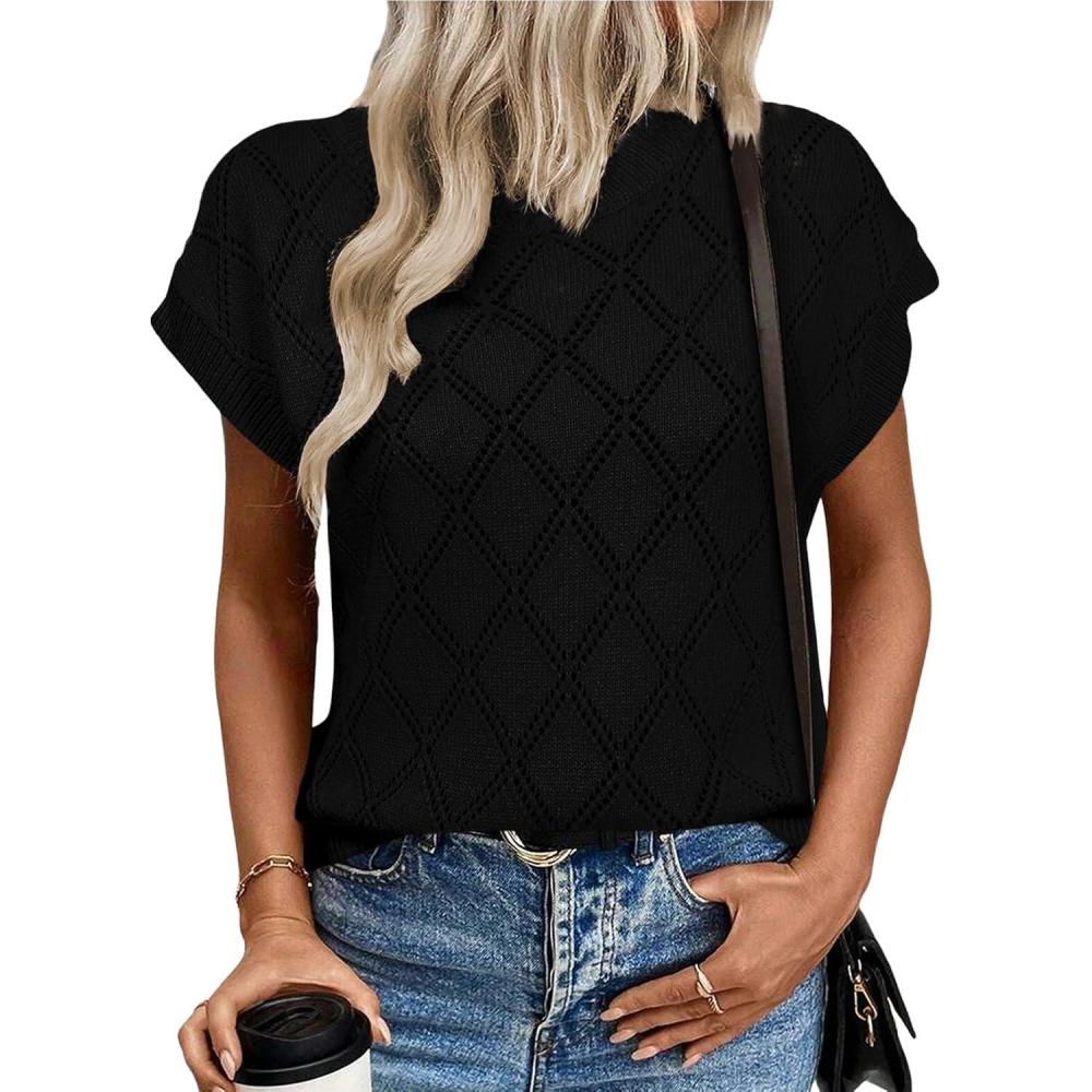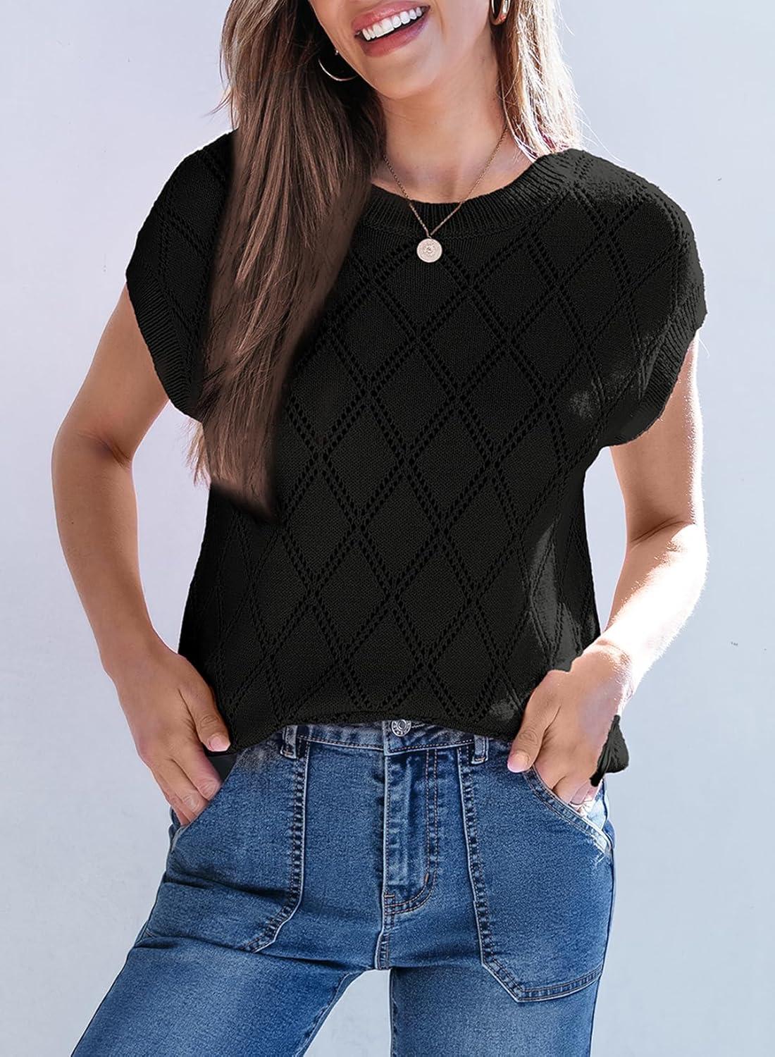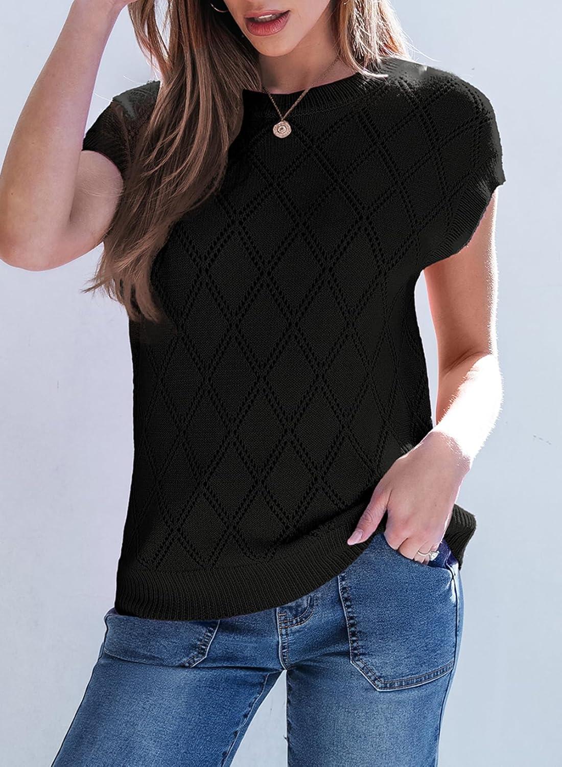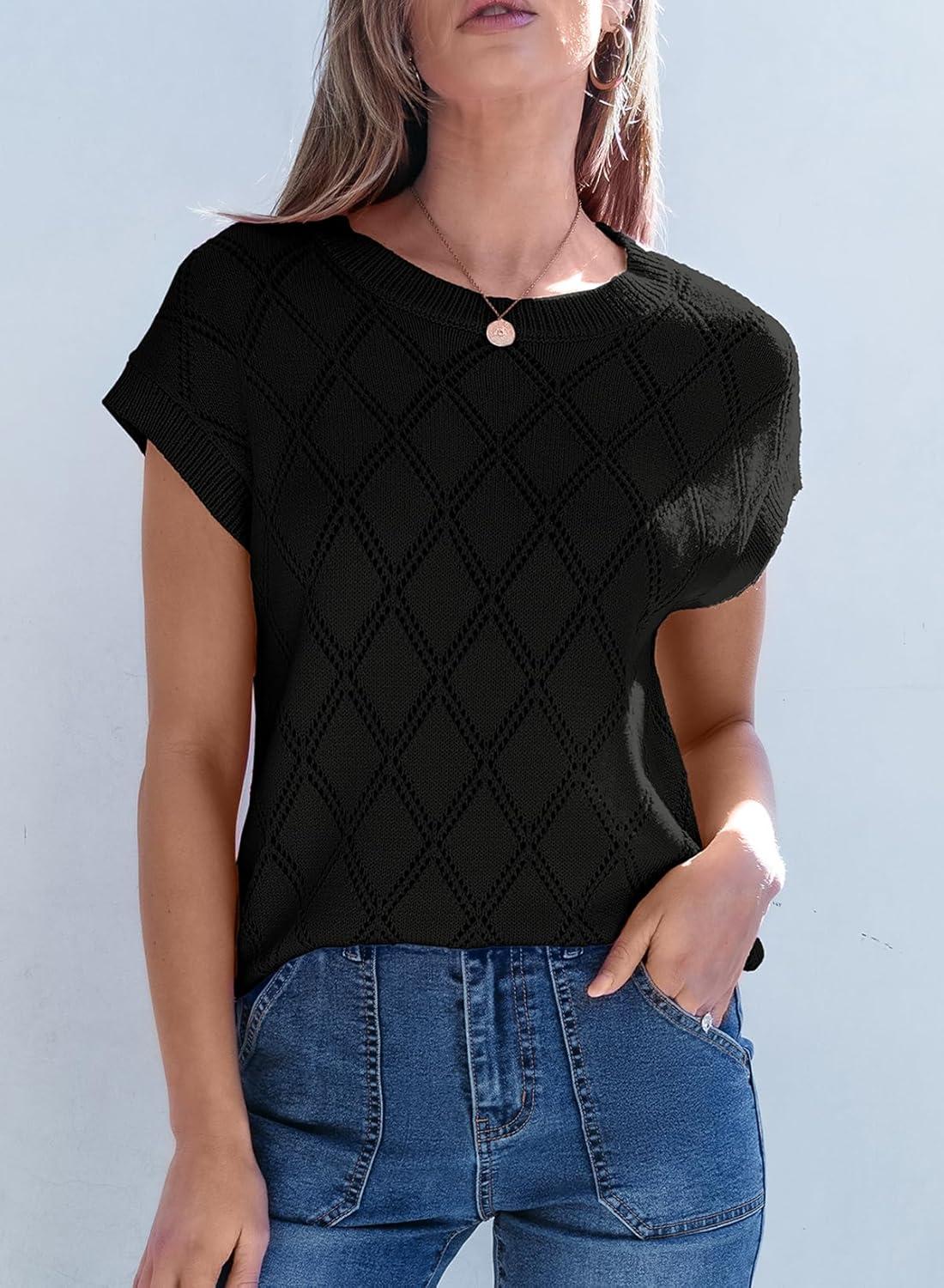 SHEWIN Womens Tops Crewneck Cable Knit Short Sleeve Sweater Loose Lightweight Blouses Dressy Casual Pullover Sweaters Top(Black)