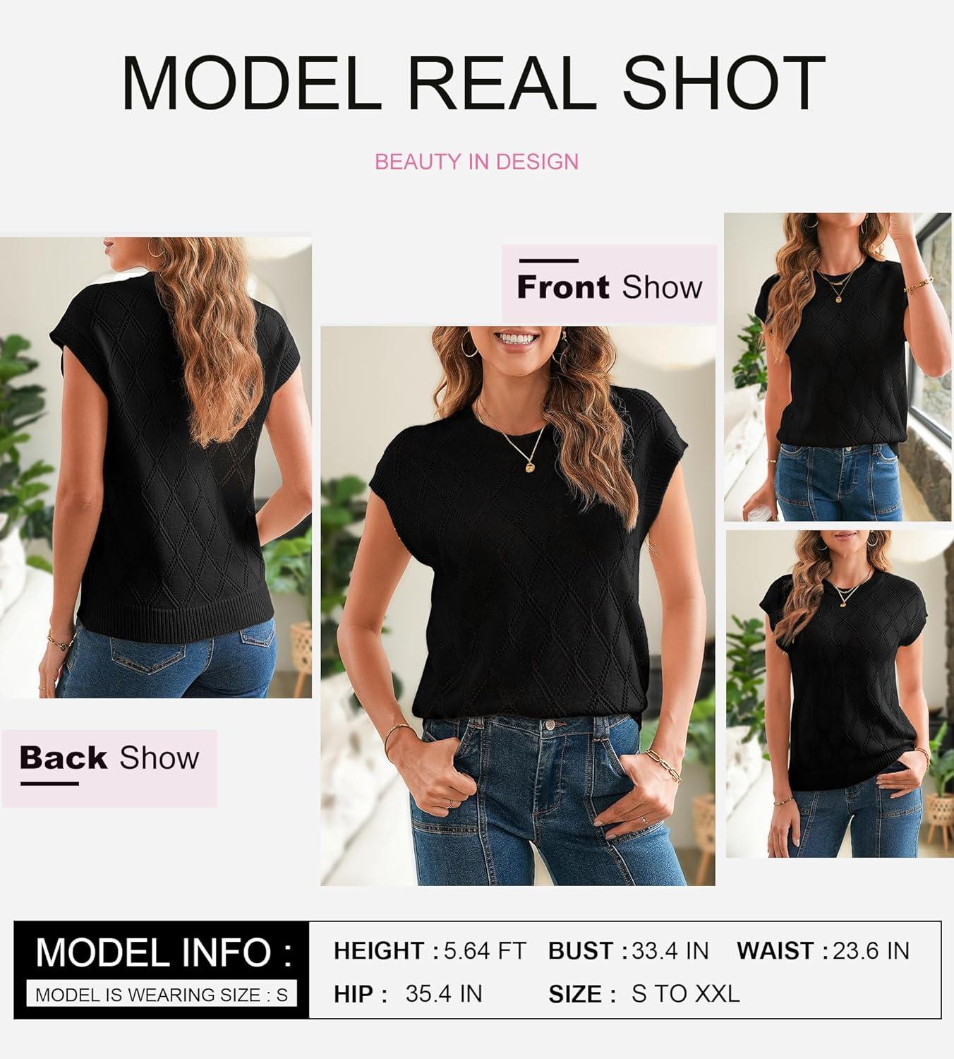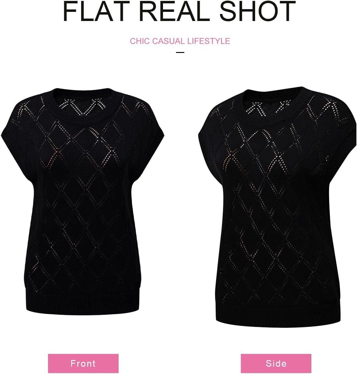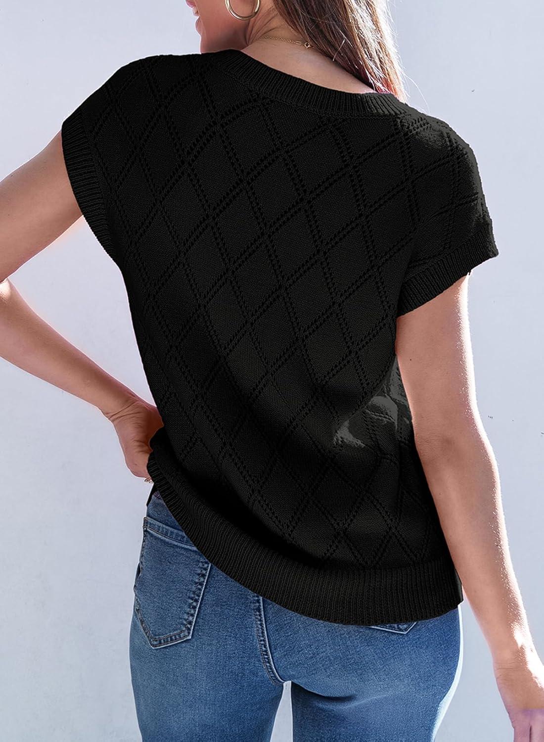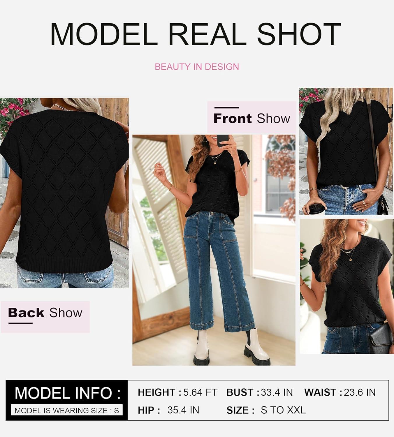 SHEWIN Womens Tops Crewneck Cable Knit Short Sleeve Sweater Loose Lightweight Blouses Dressy Casual Pullover Sweaters Top(Black)