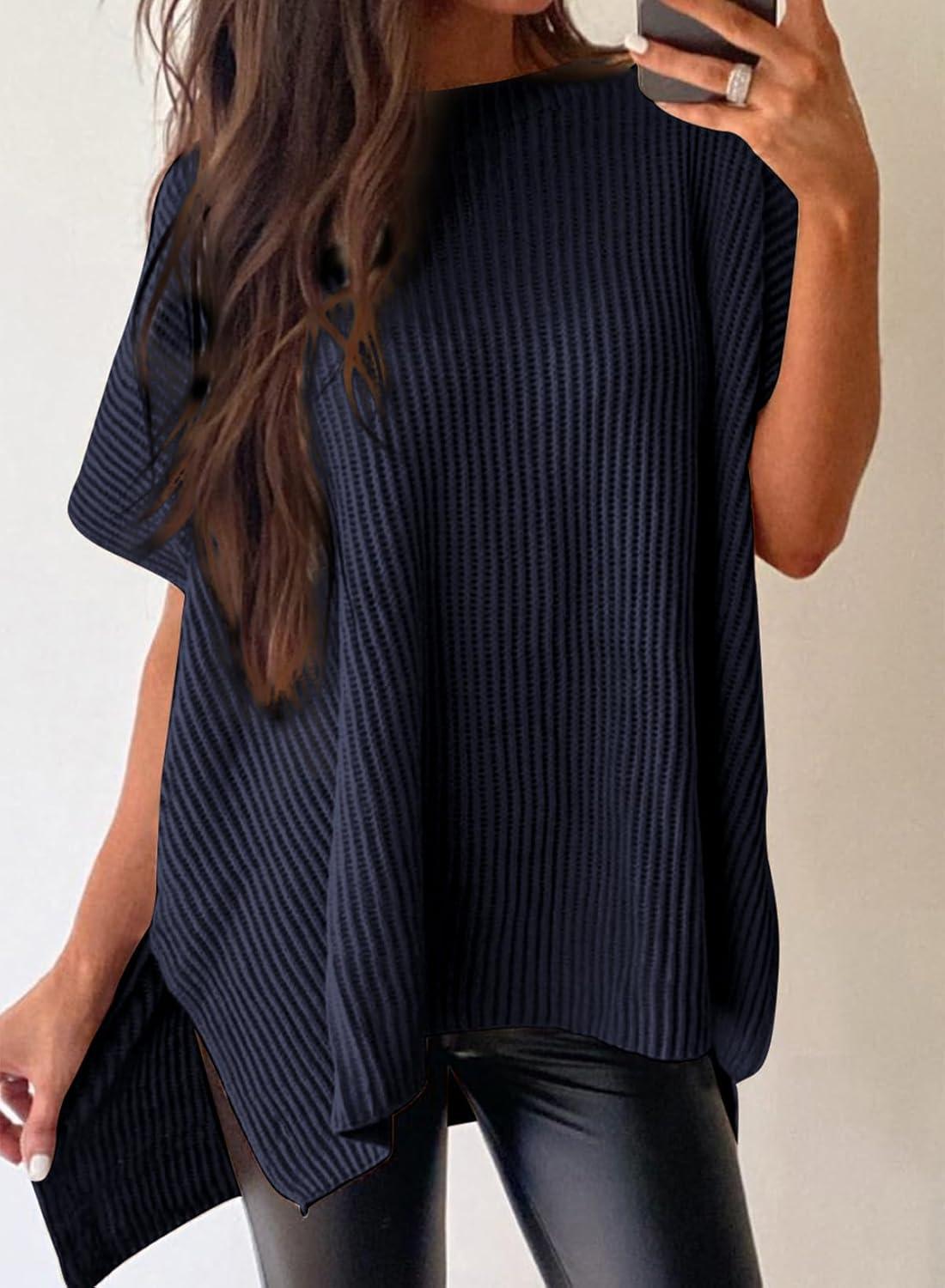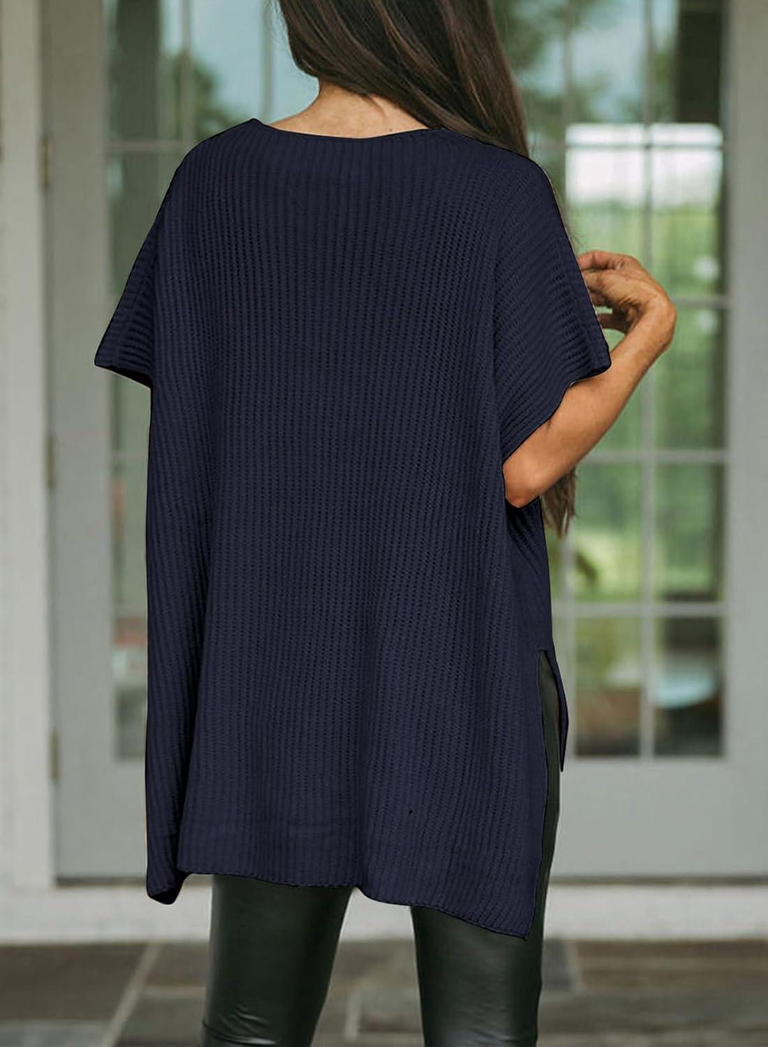 SHEWIN Womens Tops Crewneck Short Sleeve Sweater Causal Tunic Tops Lightweight Summer Sweaters for Women(B Navy Blue)